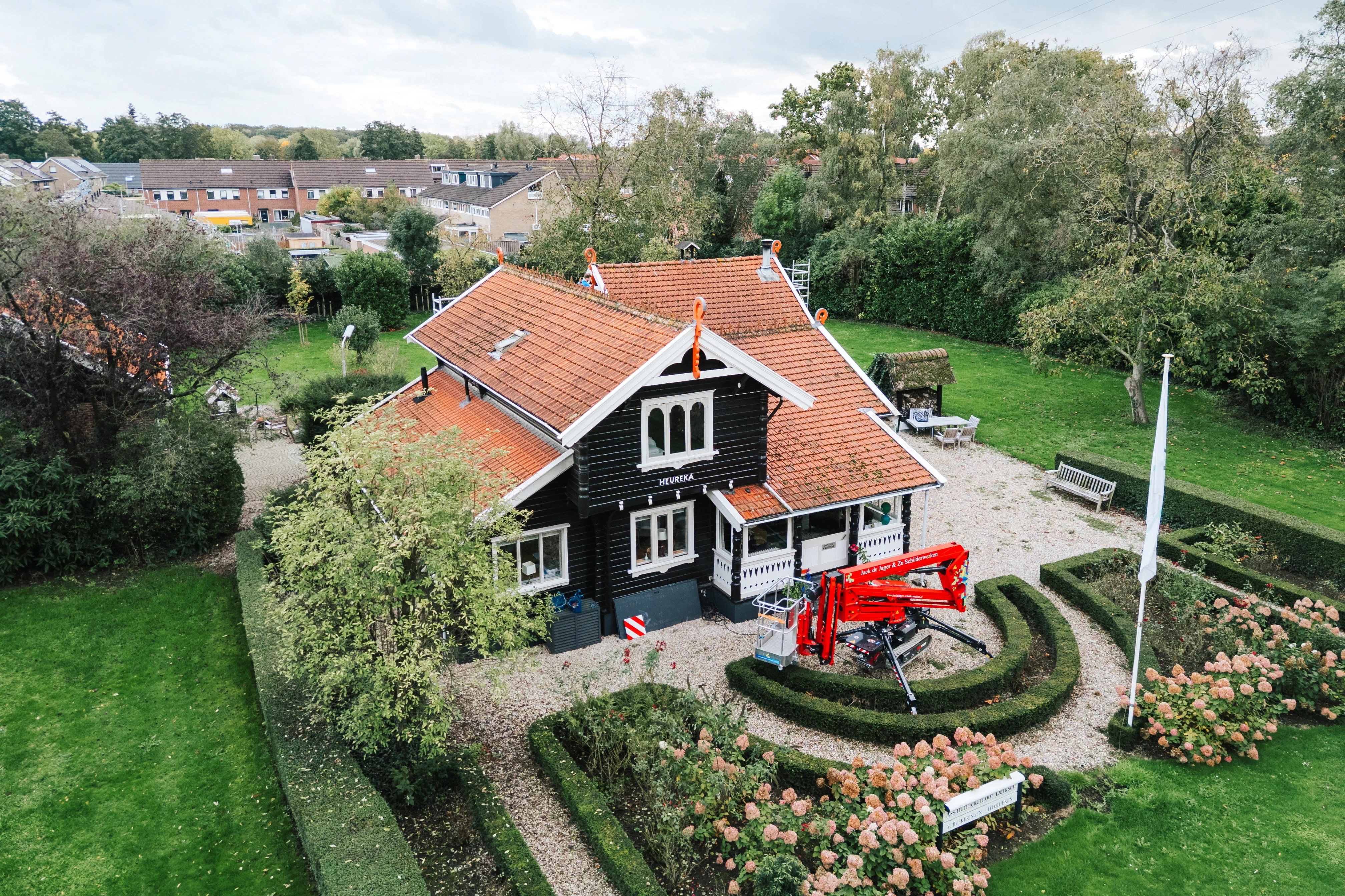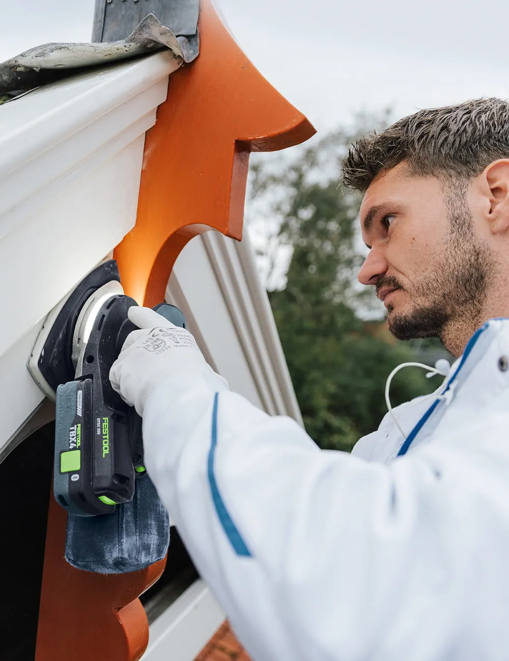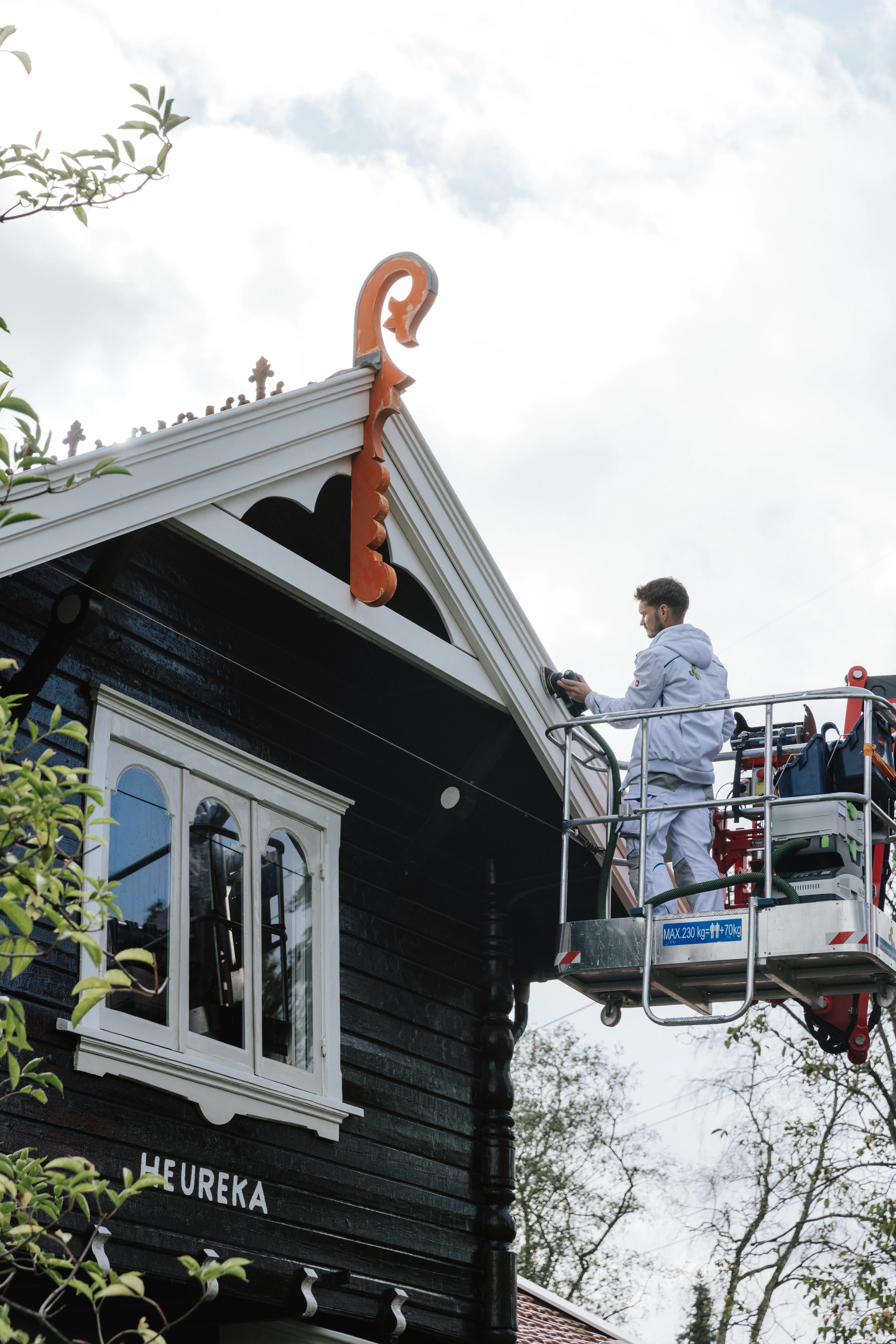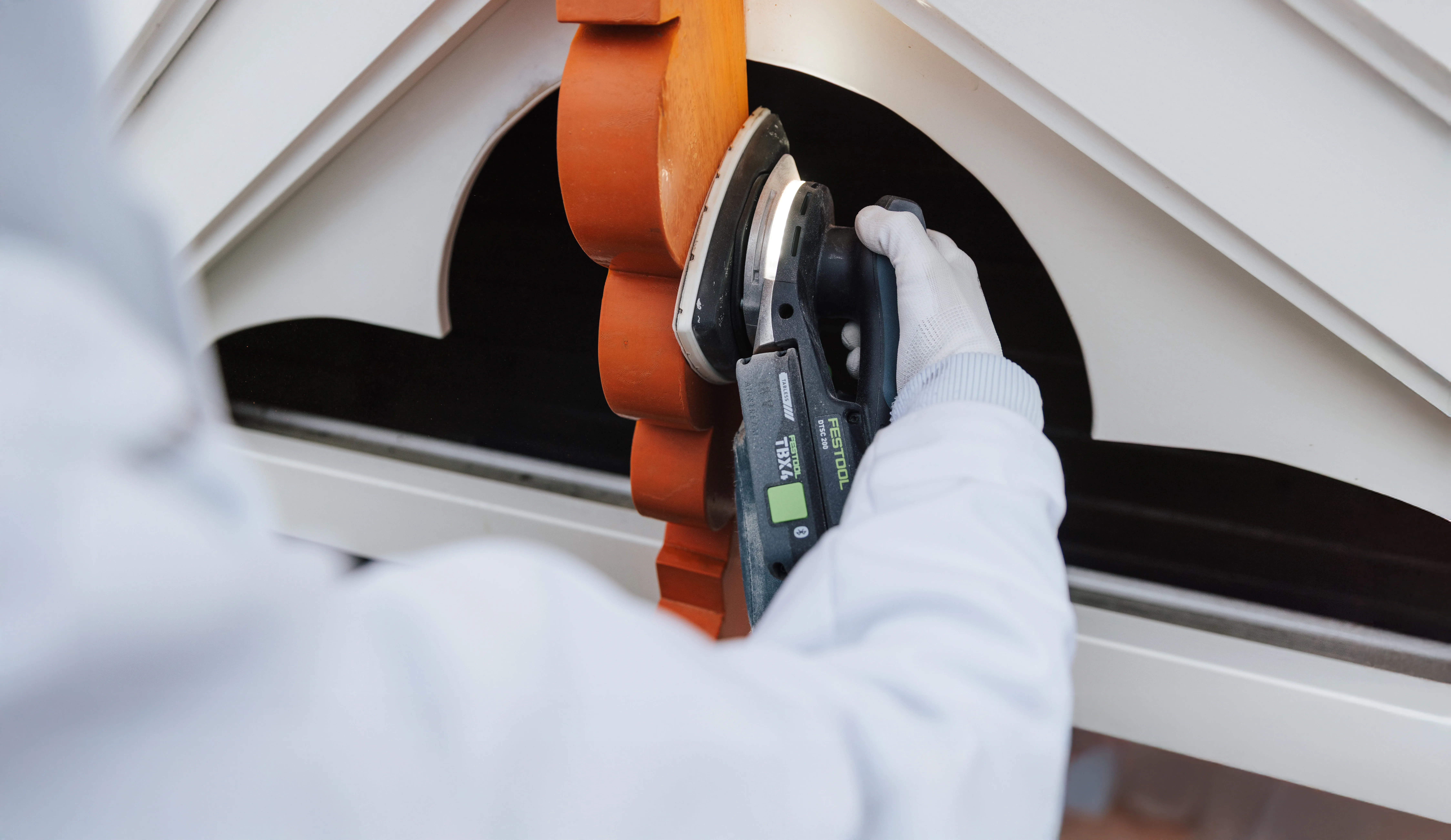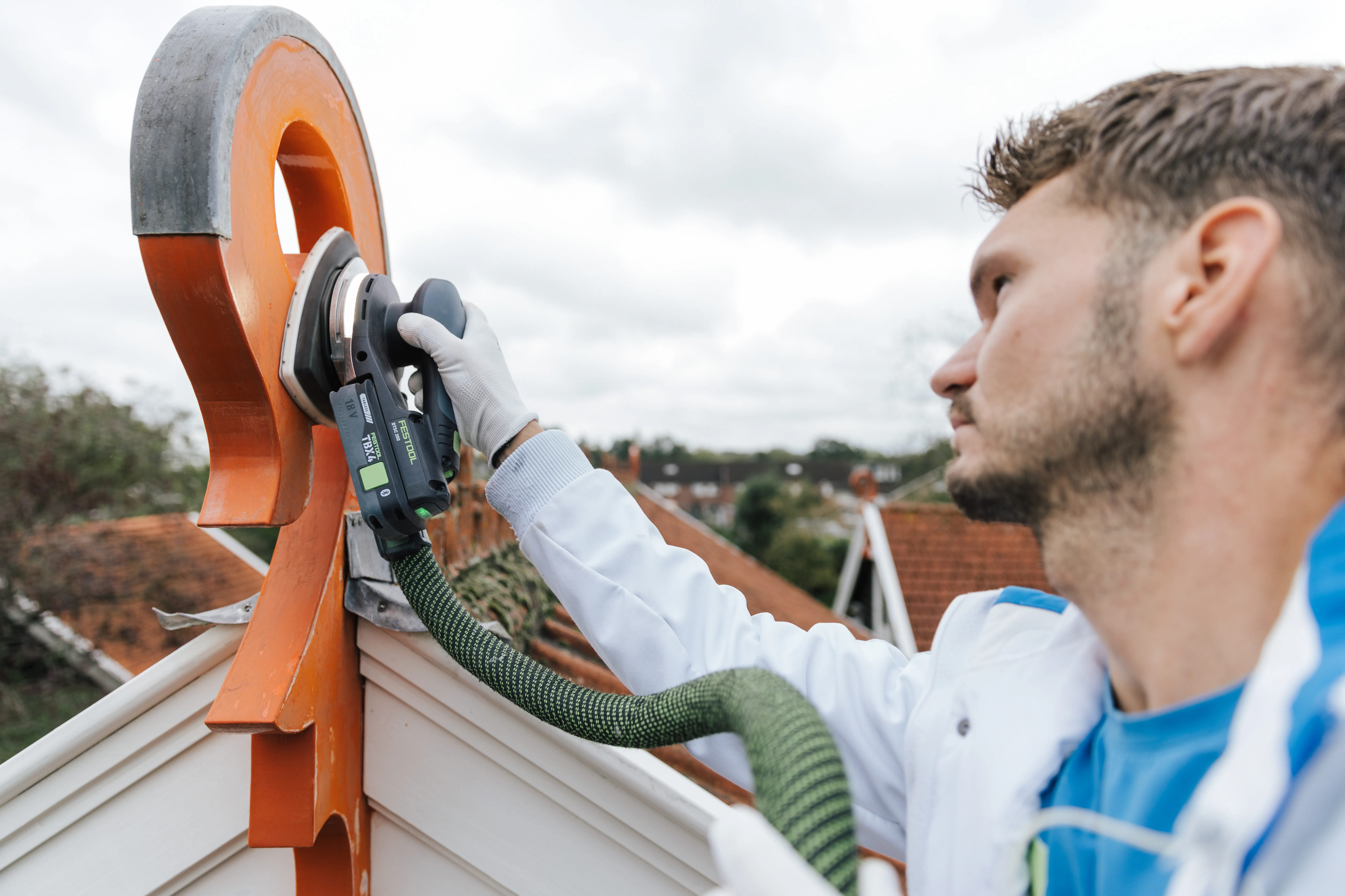 Luke de Jager's favourite place to work is high up on the Steiger. He is carefully sanding down the characteristic roof ornament, which is enthroned on the roof ridge in a muted shade of orange. The wooden surface is weathered and the coating is already peeling off. With the DTSC 200 Delta sander, Luke can also achieve curved, profiled and tapered surfaces. When things get particularly angled, he uses the DTSC 400.