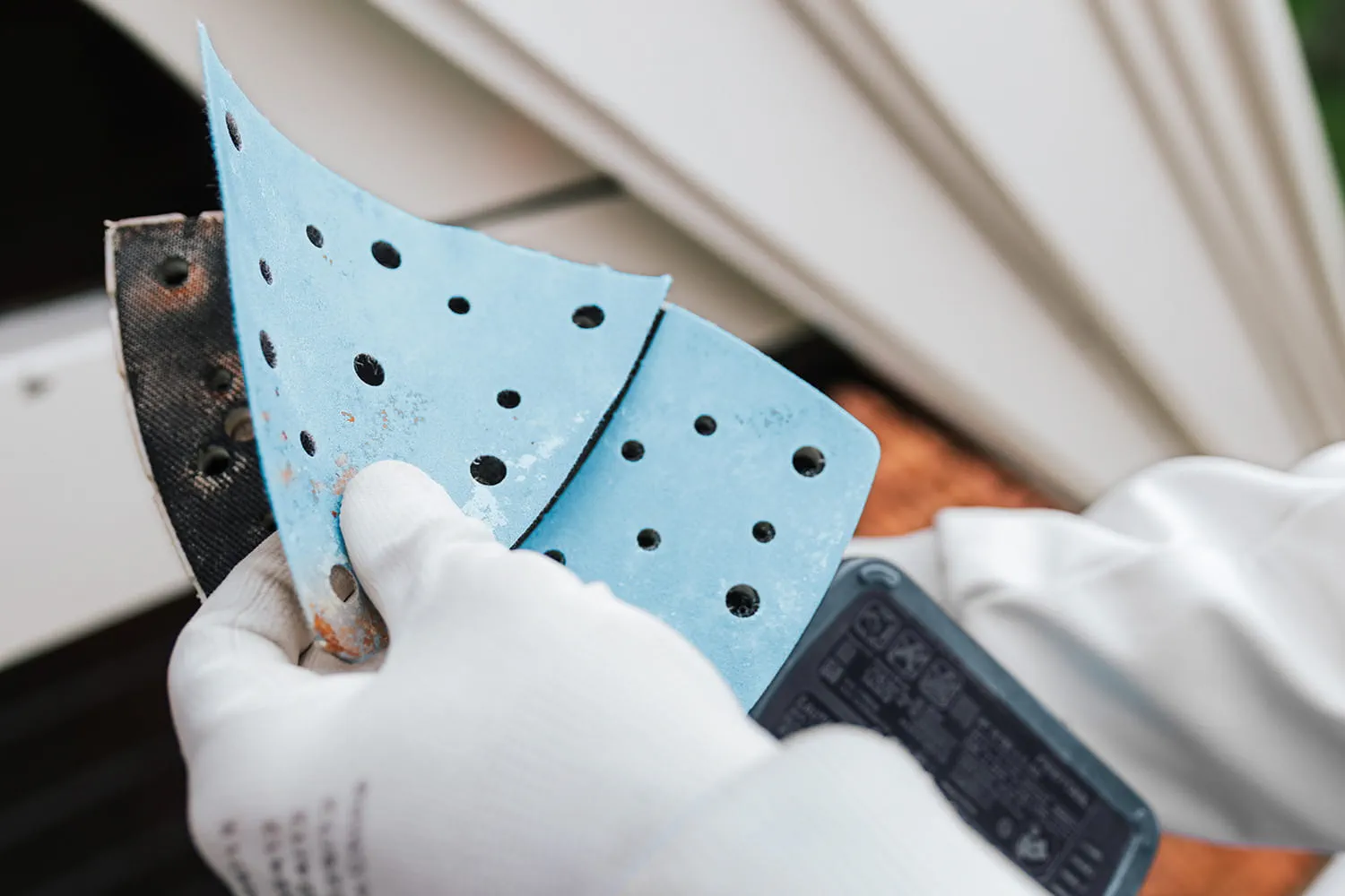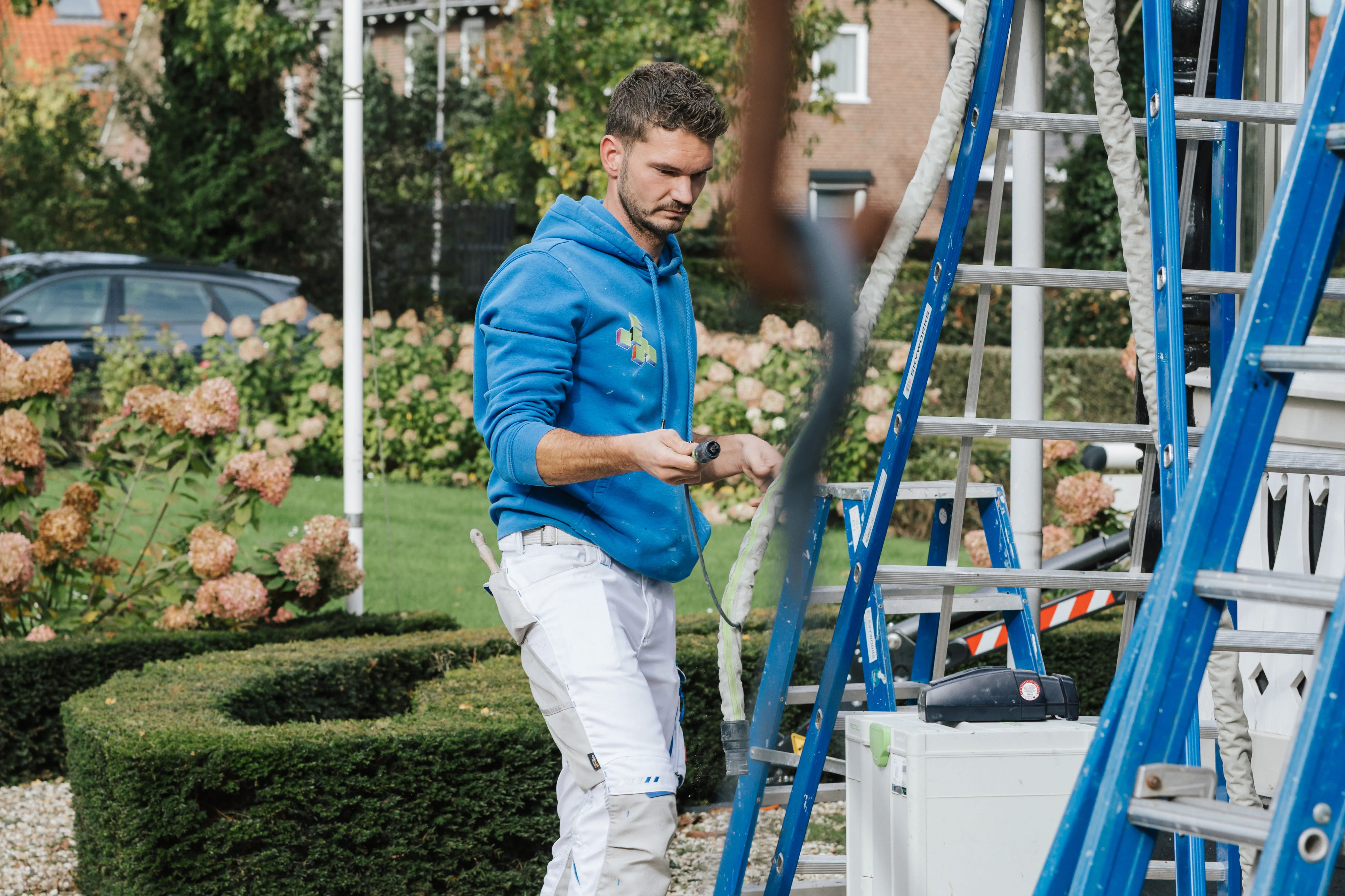 The young painter attaches great importance to working outdoors on the riser with a dust extractor or Chip collection bag. Because he can work more cleanly and protect himself. "Many of my colleagues underestimate this when they work outside," he calls down from above. "But here in Holland, you always have gusts of wind that, in the worst case, blow dust into your face when you're sanding."