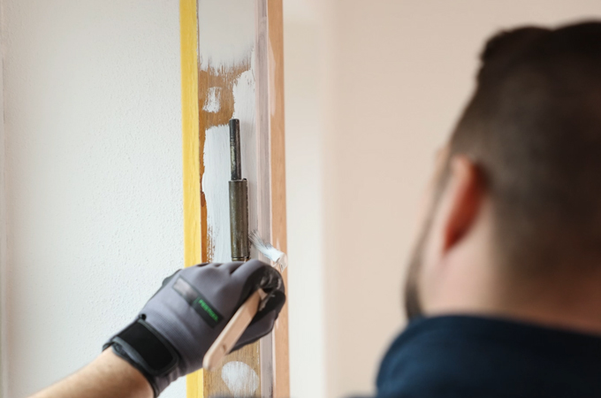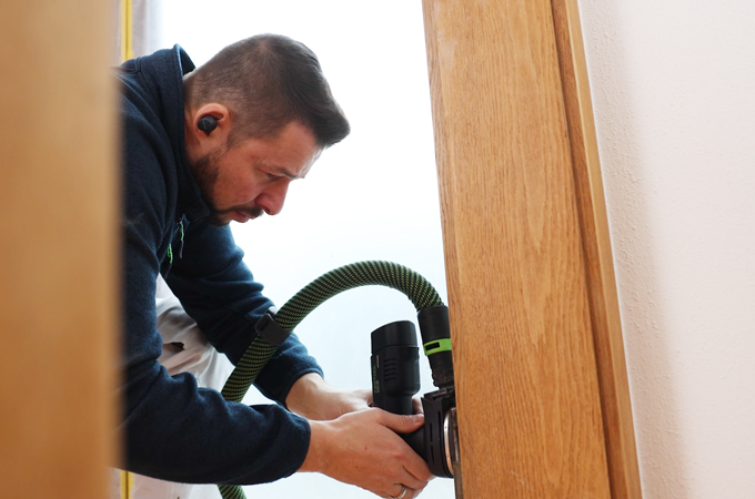 The first step is to check the door. Is there any visible damage or is the door rubbing against the floor? If there are any problems, we recommend adjusting the door to the floor height. The floor height often changes during renovations - whether due to underfloor heating or a new floor covering. We therefore measure the new height at the door hinges and shorten the door leaf to the right height using the Plunge-cut saw and Guide rail.