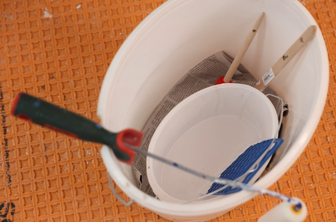 Before painting, the surfaces are cleaned again with a dust-binding cloth. In places that are difficult to access, mask off with gold tape to protect the wall, for example. The painting tools and the undercoat to be used are prepared and can be placed on the CTMC Midi at a comfortable working height. we recommend covering the Dust extraction unit with a newspaper for protection and storing the tools and paint in a bucket to avoid unnecessary contamination.