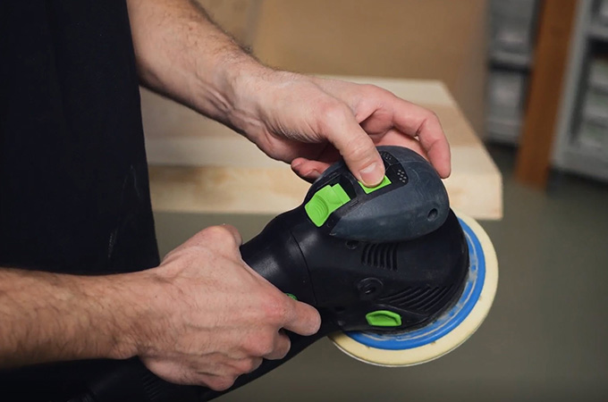 During fine sanding, the resulting sanding marks must be sanded up so that they are no longer visible after the surface treatment. To do this, the P120 grit is initially left on the machine. The ROTEX is switched to the eccentric movement (fine sanding). The sanding marks from the coarse sanding are then removed. Here, too, work is carried out in a cross motion.