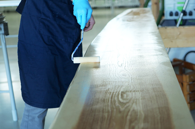 With woods such as oak, it makes sense to water the surface before the final sanding. To do this, moisten the surface with a damp sponge or cloth. The wood fibres stand up and can then be levelled with a final fine sanding after drying. During intermediate sanding after the first surface coating, these fibres are already cut and the surface becomes even smoother. Soaking is also a great advantage when working with stains.