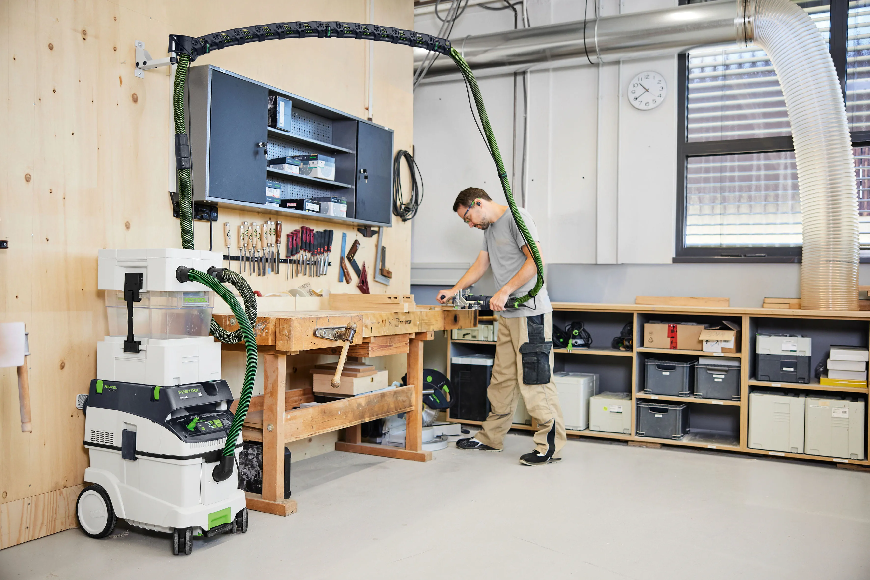 Festool has been known for its extractors and its entire dust extraction range for many years. The German manufacturer offers a variety of clever solutions for many needs in order to optimise workflows and ideally organise workplaces. Thanks to many practical aids, you can also get the most out of dust extraction. In this way, customised, mobile and flexible solutions create a healthier working environment in workshops and on the go at construction sites.
