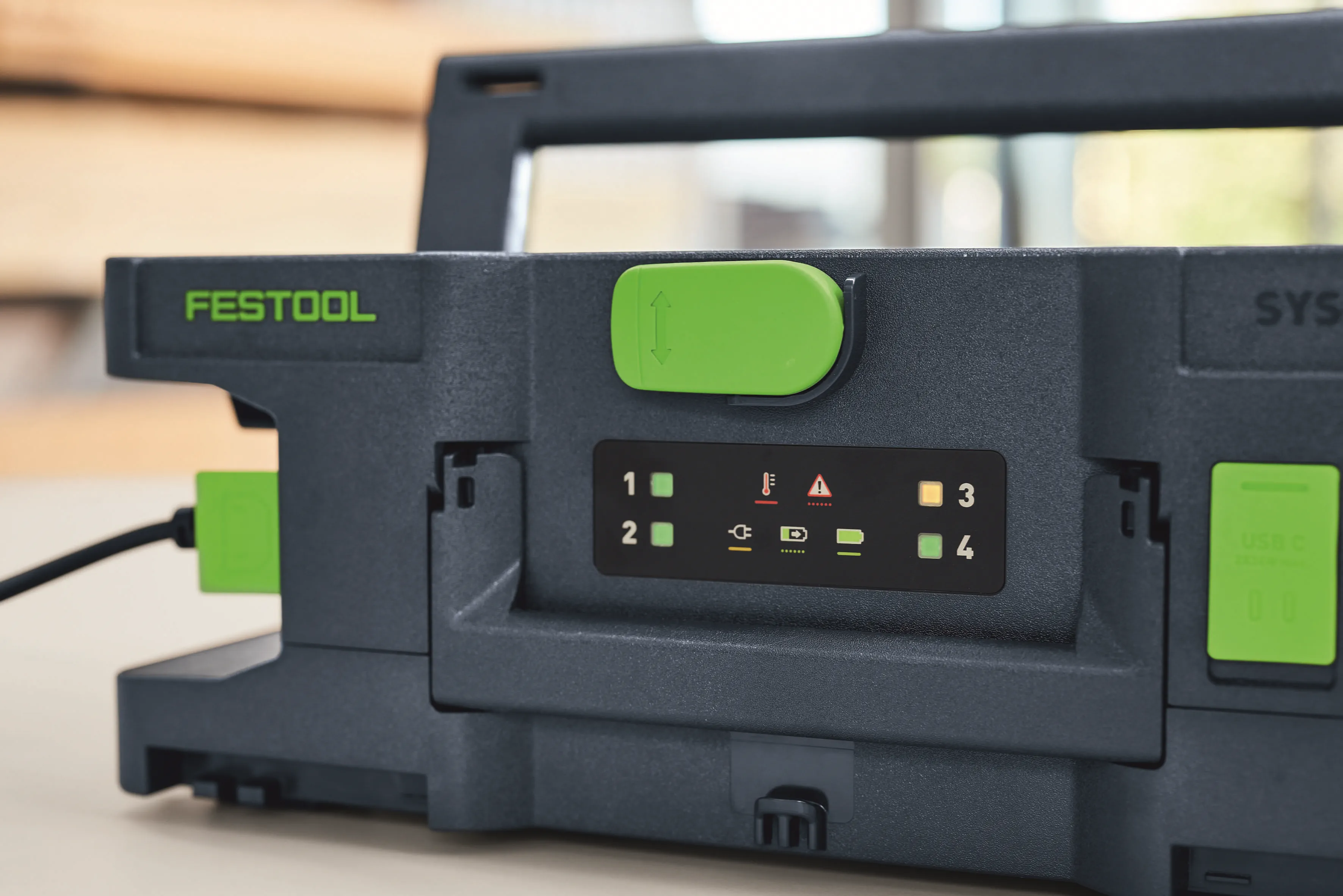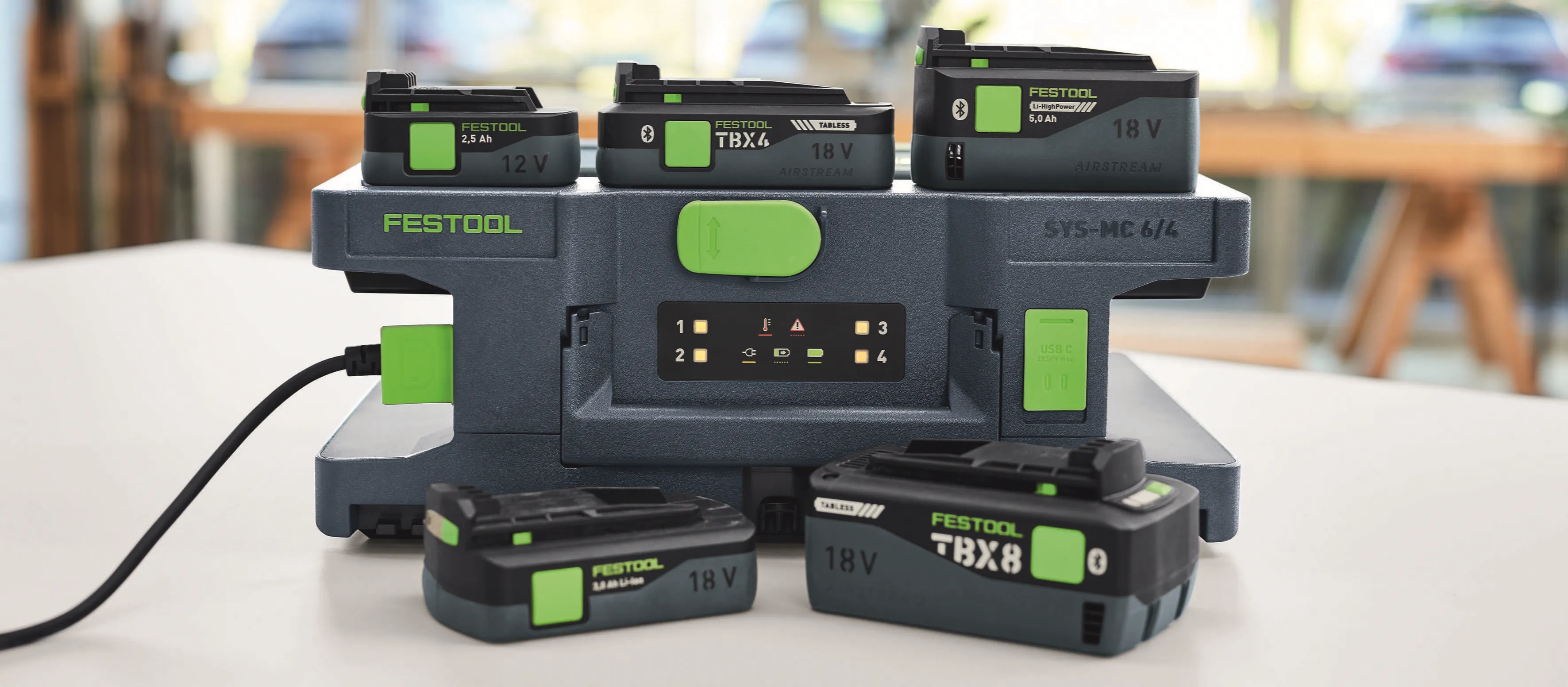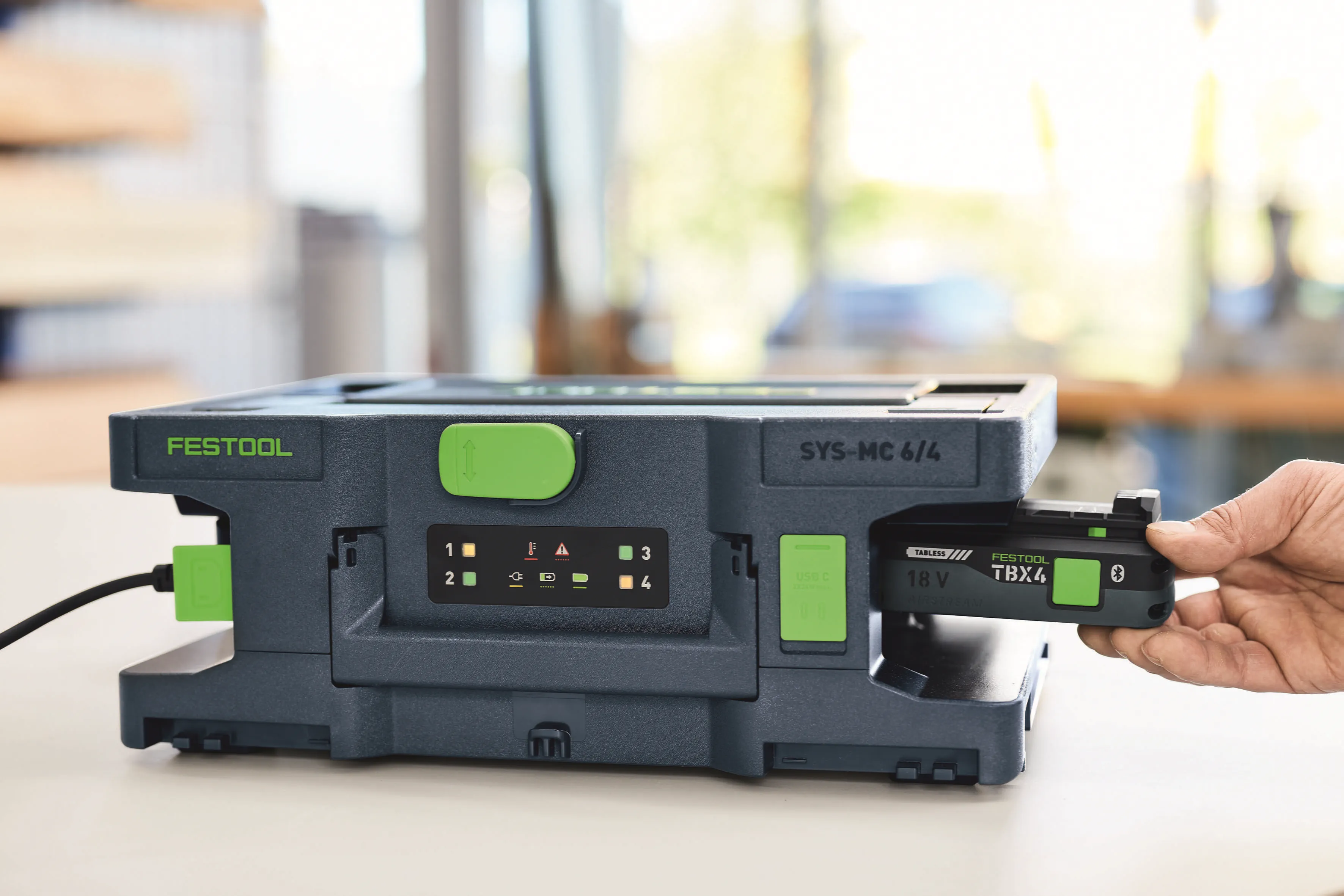 With the new SYS MC 6/4 quick charger, Festool is sending a strong signal to everyone who works at full power every day. The multi-charger expands the 18- volt portfolio with a solution that noticeably reduces stress, speeds up processes and ensures a working environment that simply runs smoothly. Fully integrated into the Systainer system, it is aimed at professionals who need to rely on their battery packs just as much as on their tools – and who value clean organisation and maximum operational readiness.