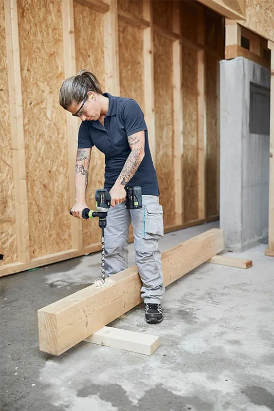 In addition to the hammer mechanism principle, physical force and drilling quality are primarily dependent on the choice of drill bit. Festool offers drill bits and drill bit sets for working with wood, steel and mineral construction materials. For construction materials such as plastic, and especially composites, Festool recommends special drill bits. For hardwood, chipboard, plywood or MDF boards, spiral wood drill bits are perfect. When drilling in wood, the rule of thumb is: The harder the wood and the larger the drilling diameter, the lower the speed – and vice versa. Plastics can be worked using wood drill bits, but steel drill bits are better. For plastics, drilling must be performed particularly slowly and carefully so as to prevent overheating. It is therefore advisable always to keep removing the drill bit and remove chips.