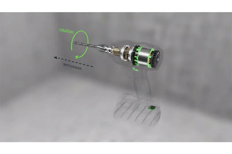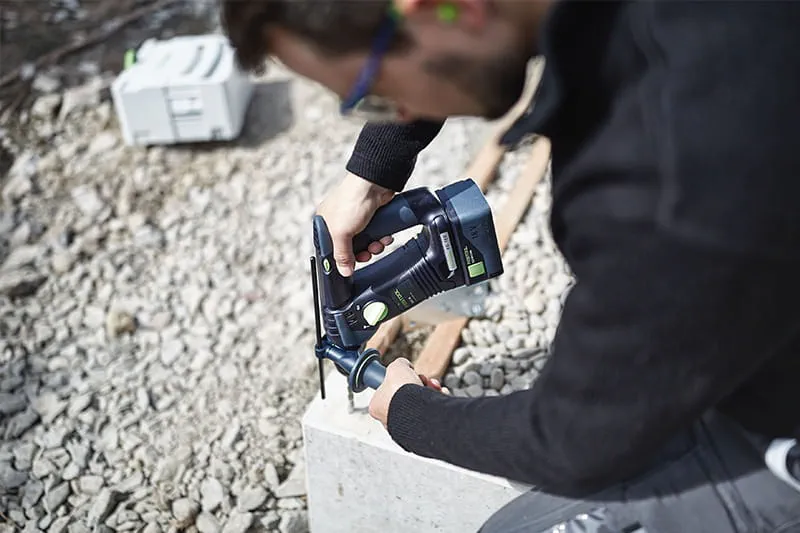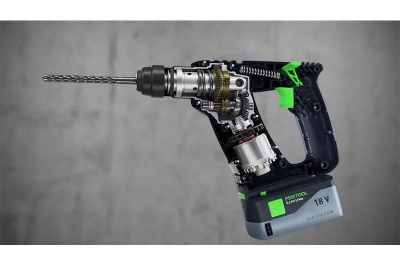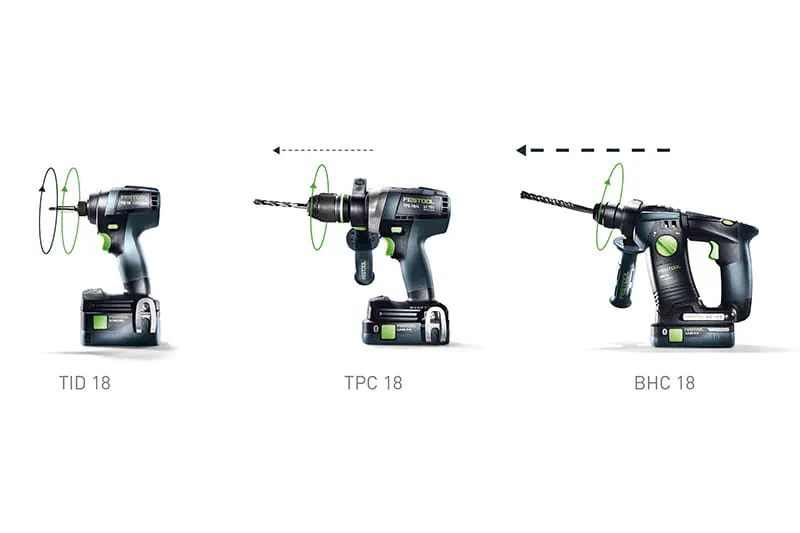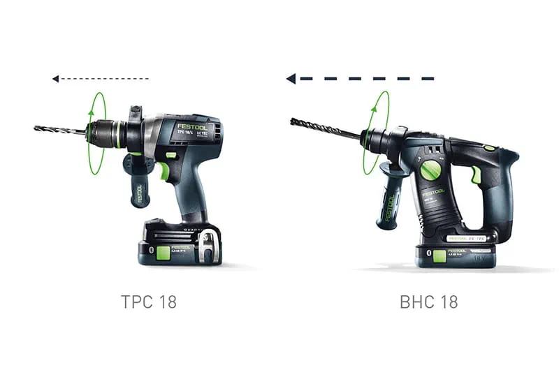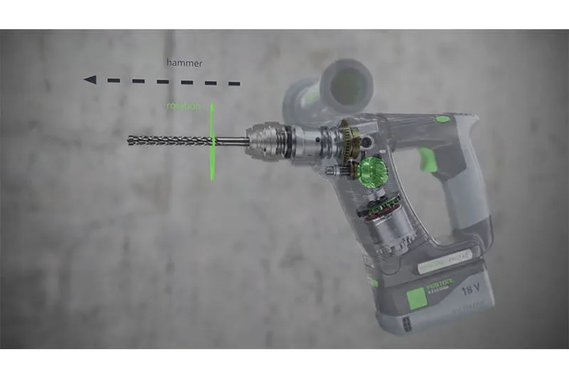 The BHC 18 hammer drill has a pneumatic hammer mechanism, which generates powerful impact energy that works in the axial direction. The resultant rotational movement guides the drilling dust backwards. A hammer drill works at a lower stroke rate, but with significantly greater impact energy than a percussion drill. This enables work to be completed more quickly. Hammer drilling in concrete requires less force than percussion drilling. Georg von dem Bussche, master carpenter and Festool trainer, recommends the BHC 18 hammer drill for harder construction materials such as concrete.