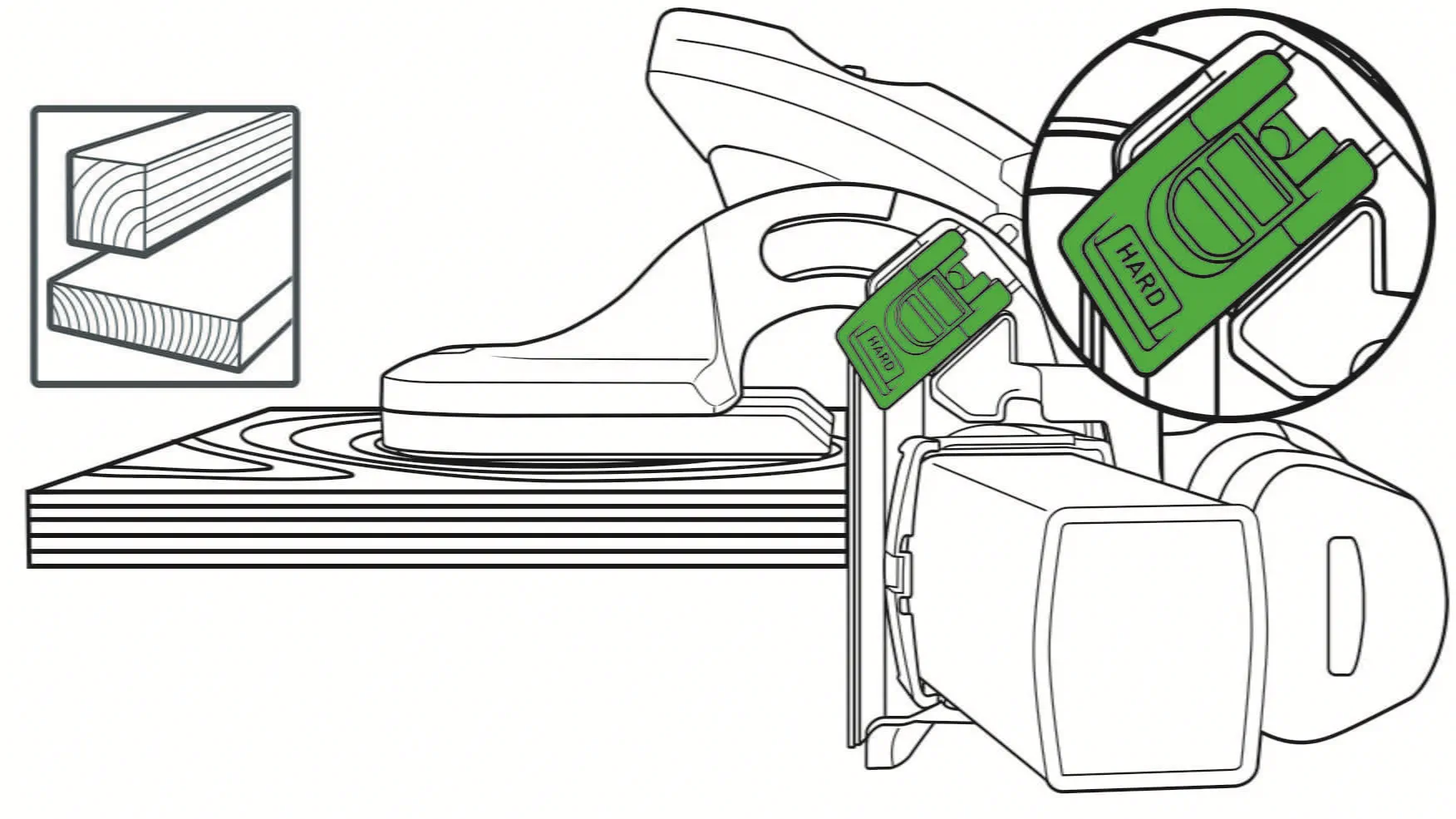 The crossheaded guide can be replaced quickly and easily depending on the surface: Velour linings for delicate surfaces, plastic lining for all other surfaces. Even painted workpieces can be sanded reliably and conveniently – as well as perfectly and reproducibly. Replacing the crossheaded guide/base runner is simple: Release the green functional element and blue arrow on the crossheaded guide, remove the crossheaded guide and fit a new one. Both crossheaded guides are always included in the scope of delivery: LAS-H-ES base runner for solid wood and LAS-W-ES base runner for painted surfaces with hook-and-loop lining for attaching a velour slideway lining for sanding smooth or delicate workpieces.
