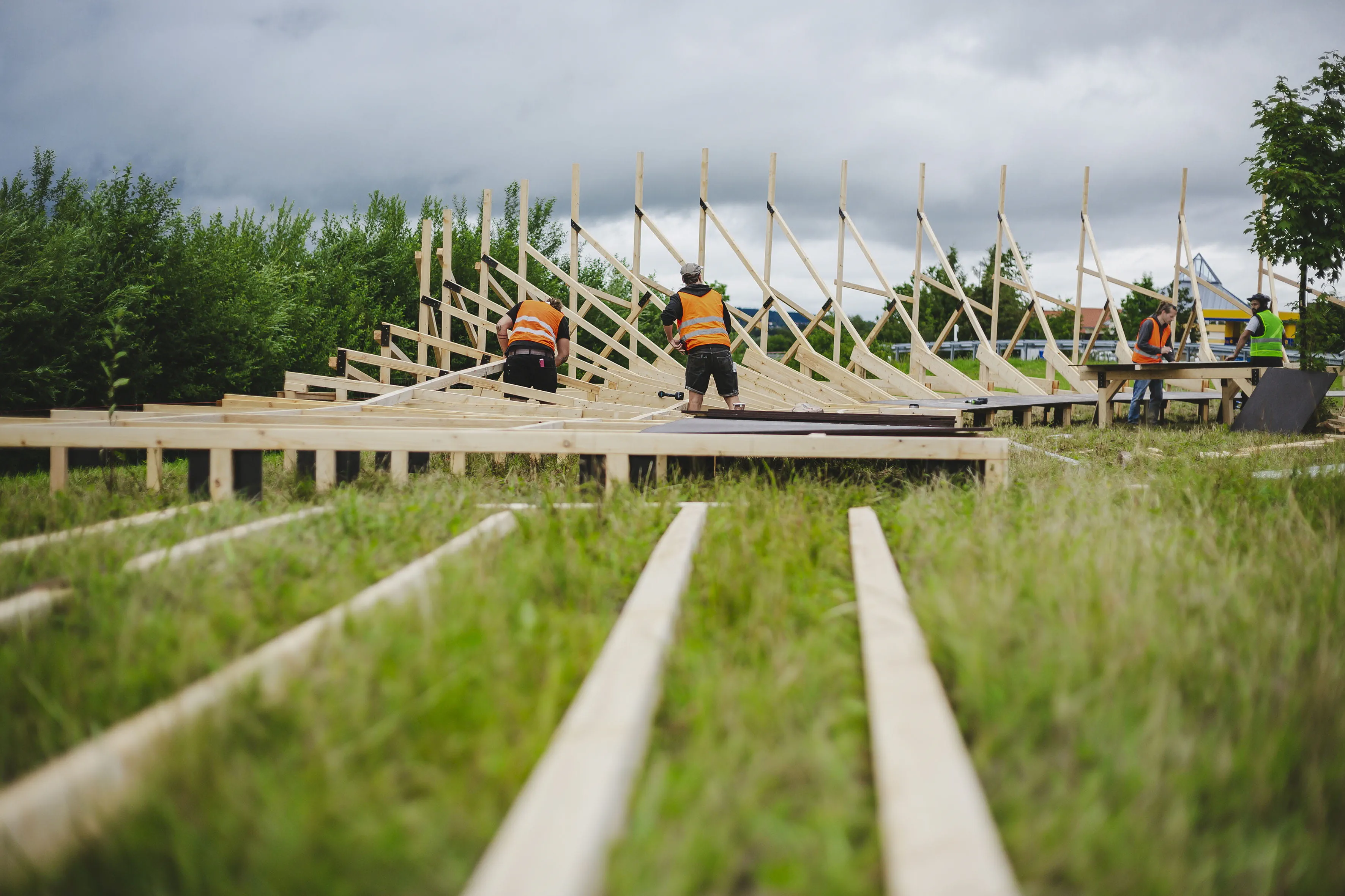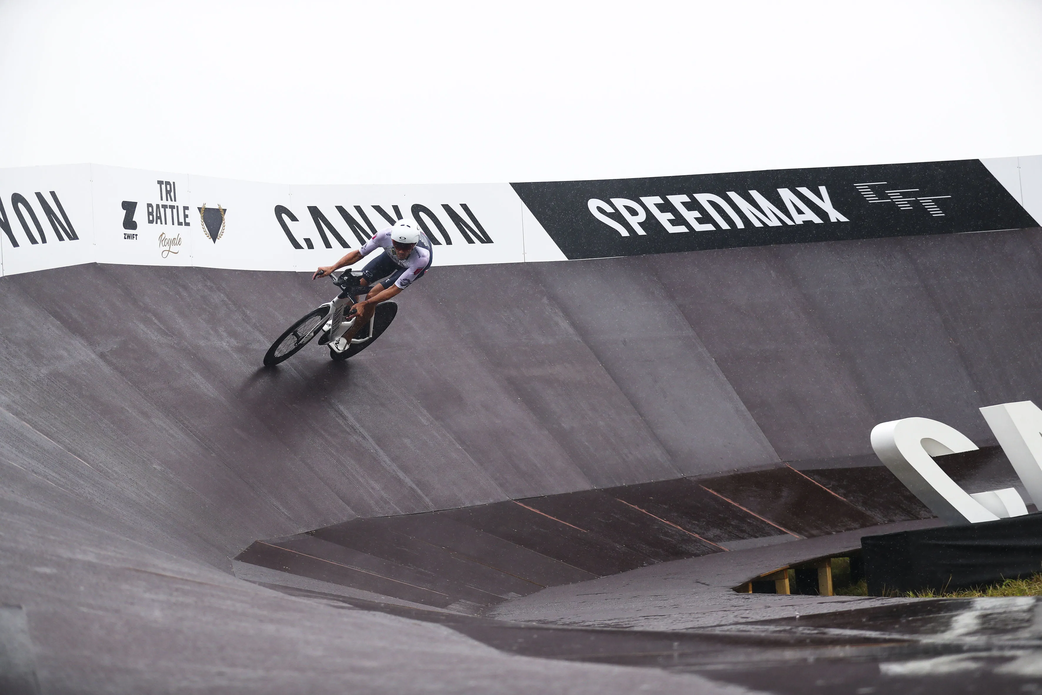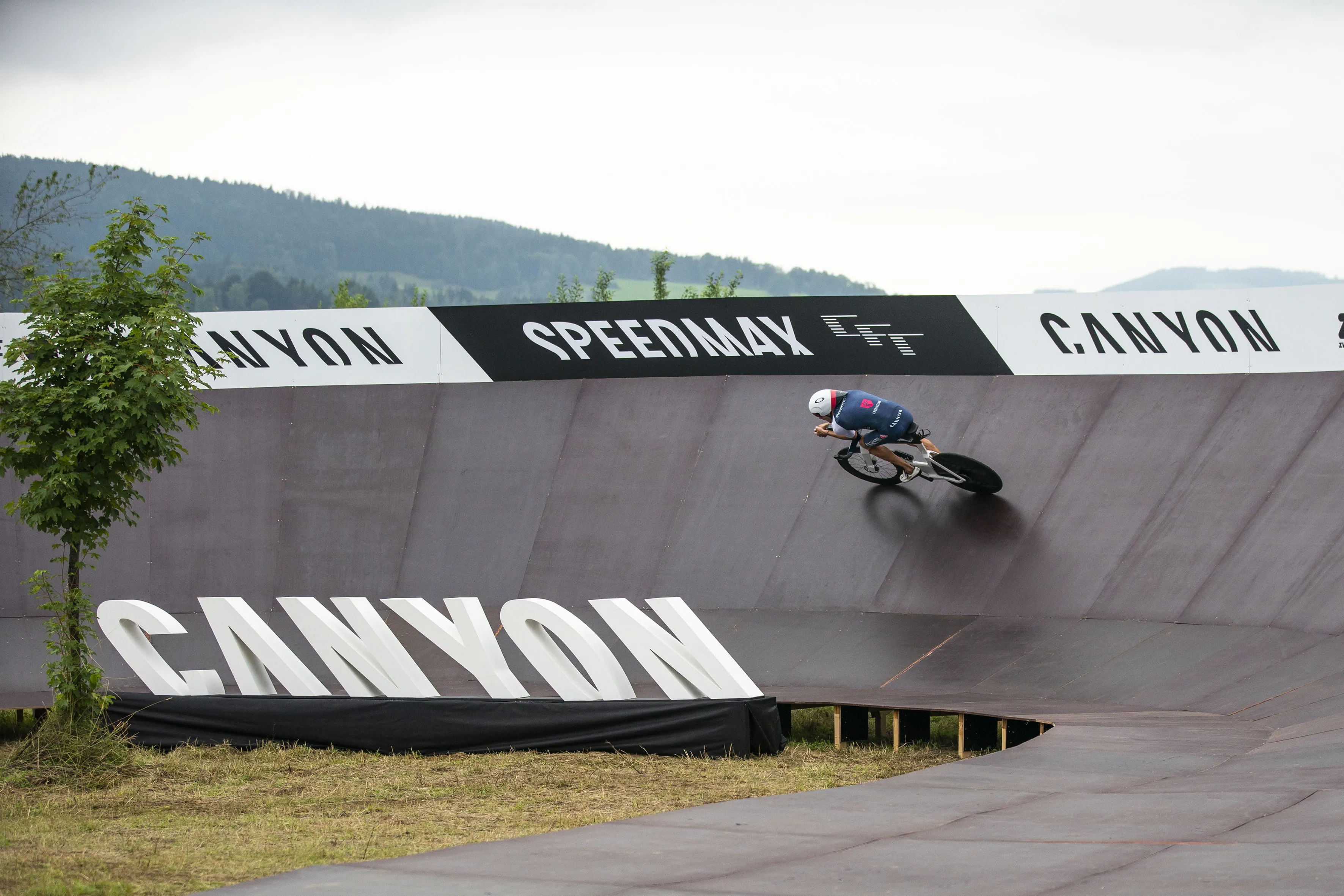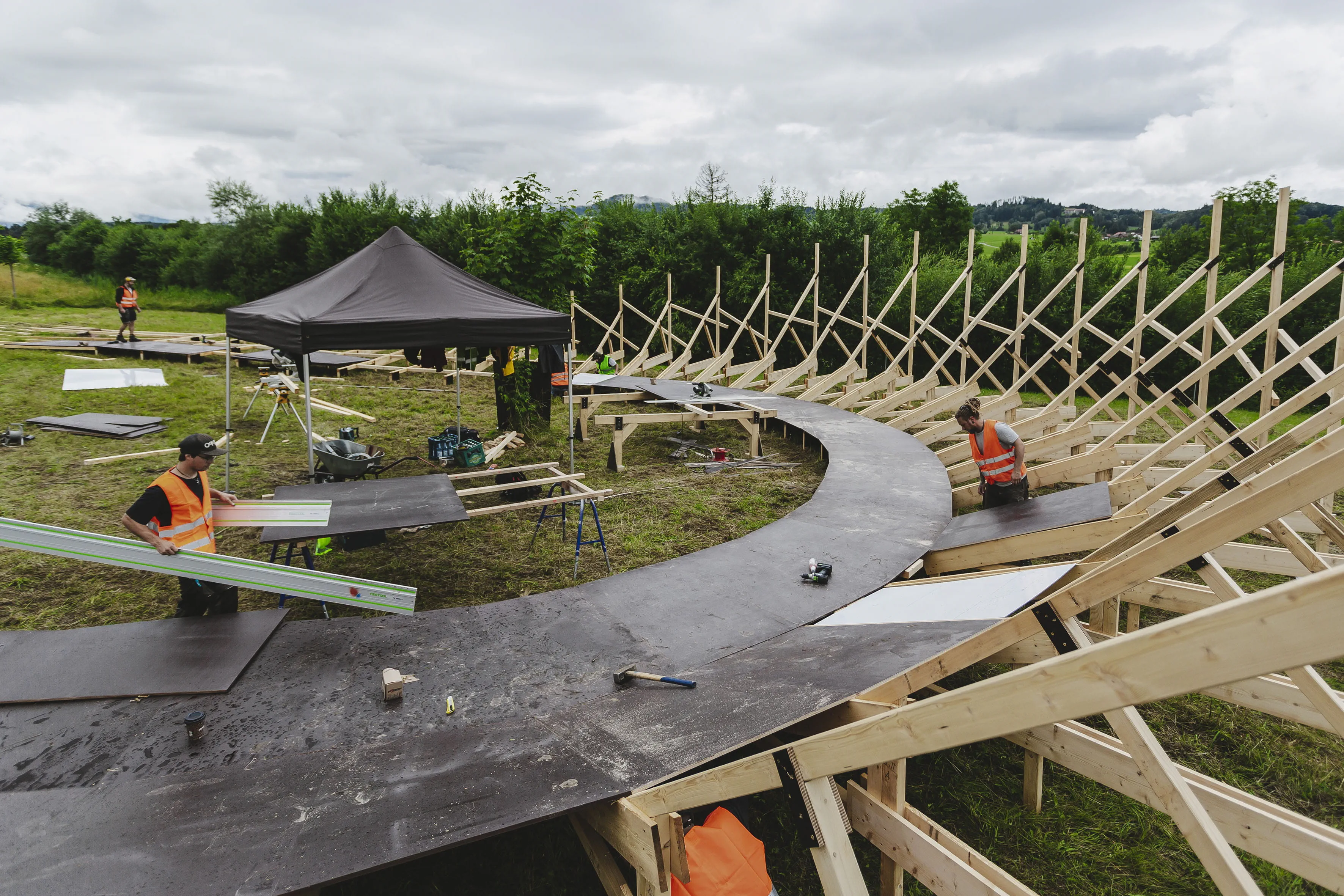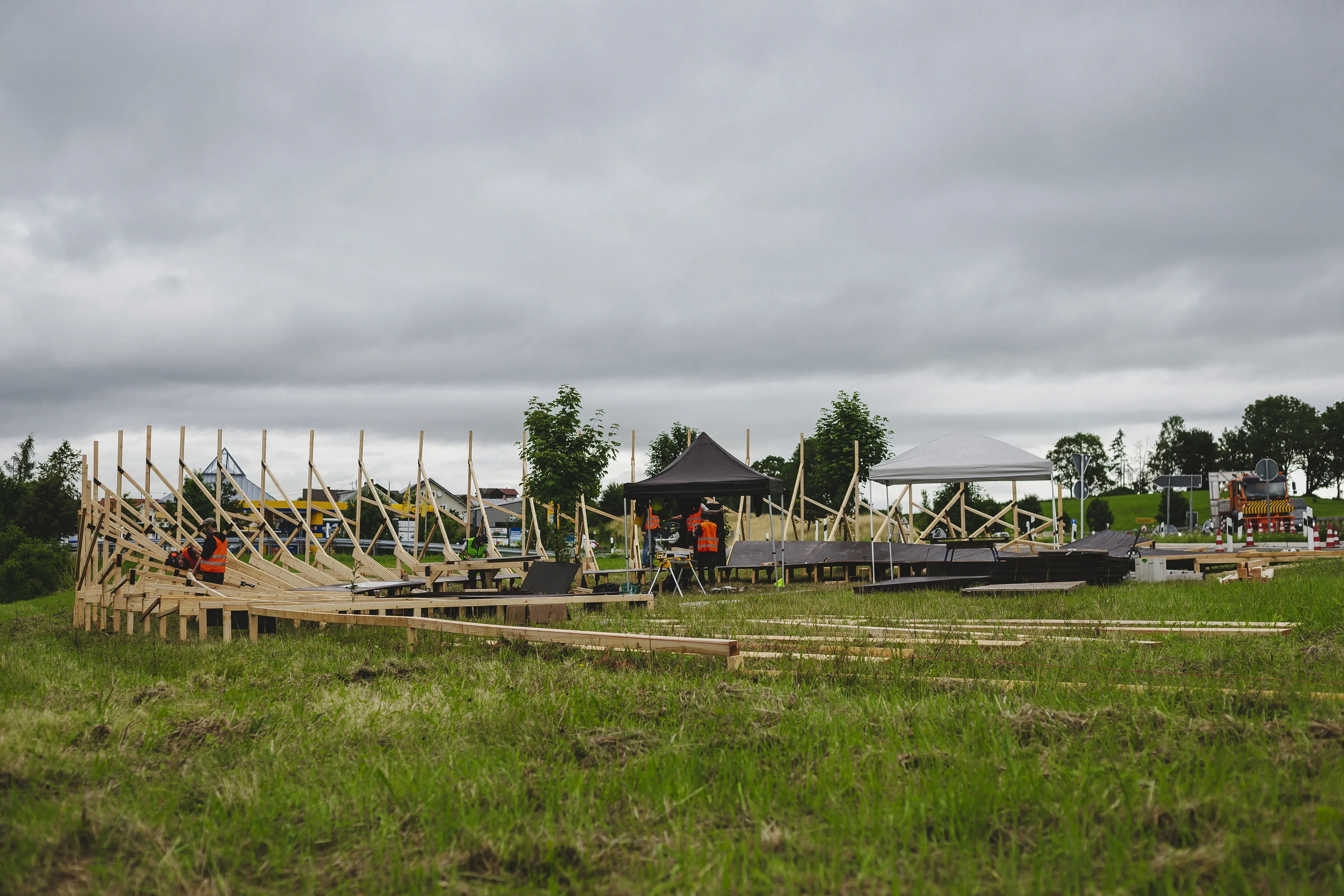 To attempt a new record time, the two triathletes not only had to be on top form, they also had to find a suitable course. Federal Highway 19, which cuts through the middle of the Allgäu region, proved ideal for this, with several laps needed to build up the required number of kilometres. A suitable turning point was identified to ensure that the record attempt was not unnecessarily slowed down. And the best solution to save valuable seconds? A ramp. Made entirely from wood and similar to the steep banks used in track cycling, this guarantees a quick turnaround. And it was the perfect type of structure for Schneestern. To ensure clarity, the Tri-Battle organisers contacted Schneestern, an action sports specialist based in Durach in the Allgäu region, whose CEO, Dirk Scheumann, was keen to be involved. And while passionate about the idea, he also knew that a bit of wood and a few screws would not be enough. Owing to the kind of speed and load it would be subjected to, the bank would have to be sufficiently stable. After some initial designs, sketches and a prototype, the project began to take shape. Nineteen-thousand screws, 10.5 cubic metres of wood and 96 textured coated boards – that's how much material was required to support Frodeno and Sanders in their new cycling record attempt. At a length of 75 metres, a height of 4.5 metres and taking 300 hours to build, the "Canyon Turn" was anything but lightweight, and an exceptional piece of craftsmanship. Malte Ahrens, project manager at Schneestern: "It was massive – huge!" Construction of the steep banked curve on the approach to the closed main road presented a particular challenge, and took three days to complete. Although considerably quicker to dismantle and all done by the end of the same day following the Tri-Battle, the components for the challenge were transported to site already pre-assembled and then put together there in a building block system. There were several essential requirements: Everything had to sit in exactly the right place. Nothing was allowed to wobble, nothing was allowed to shift.