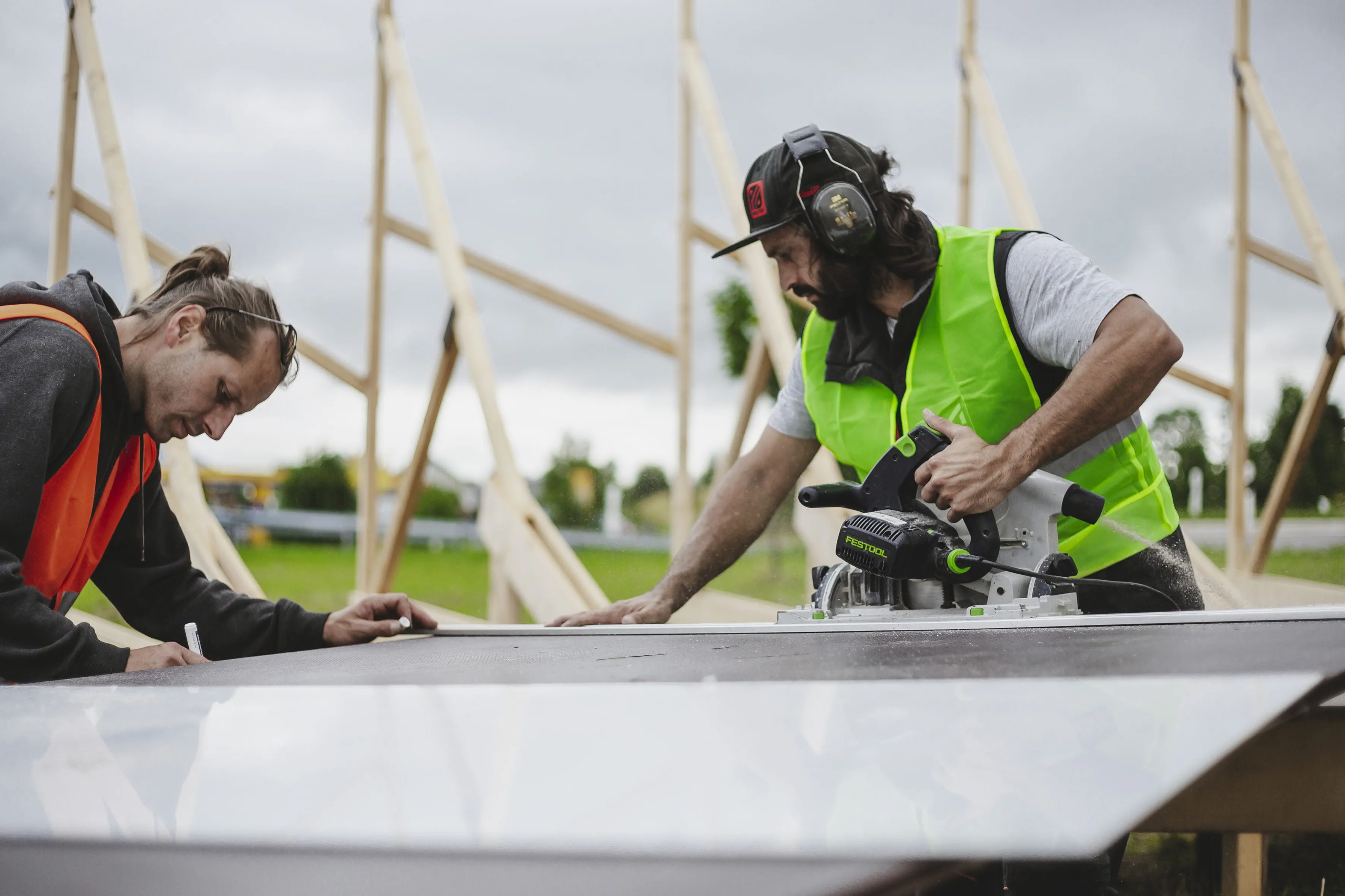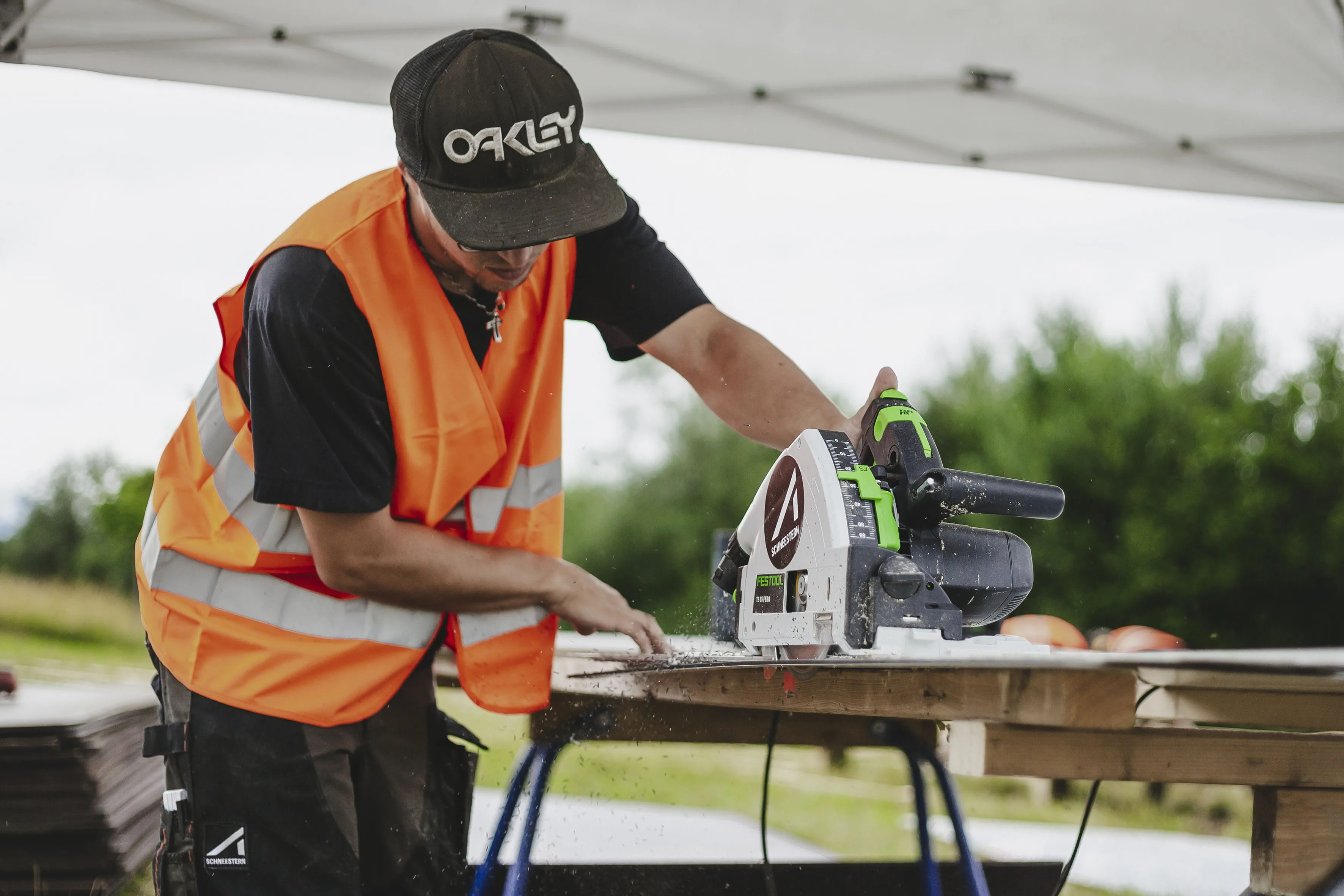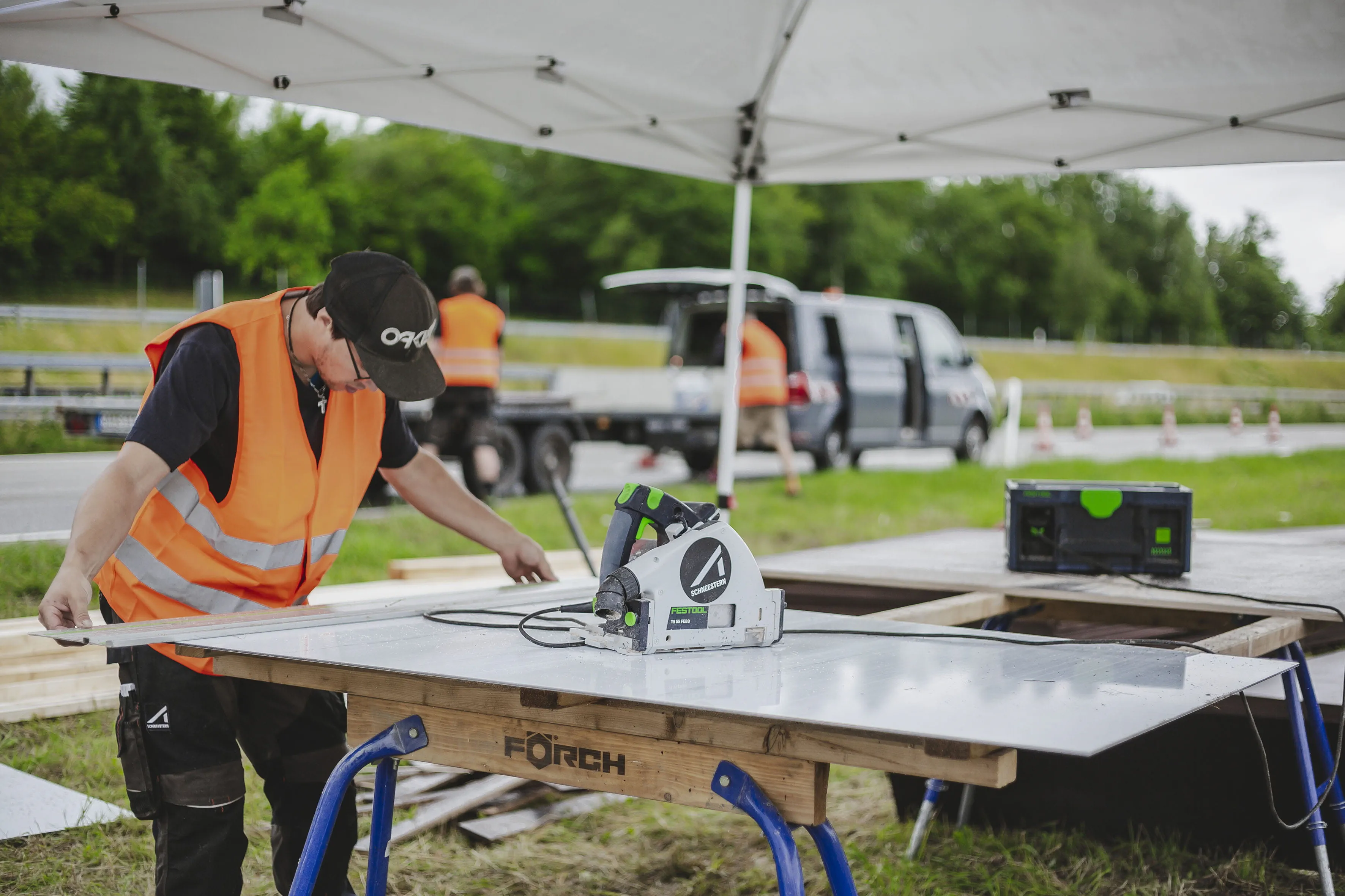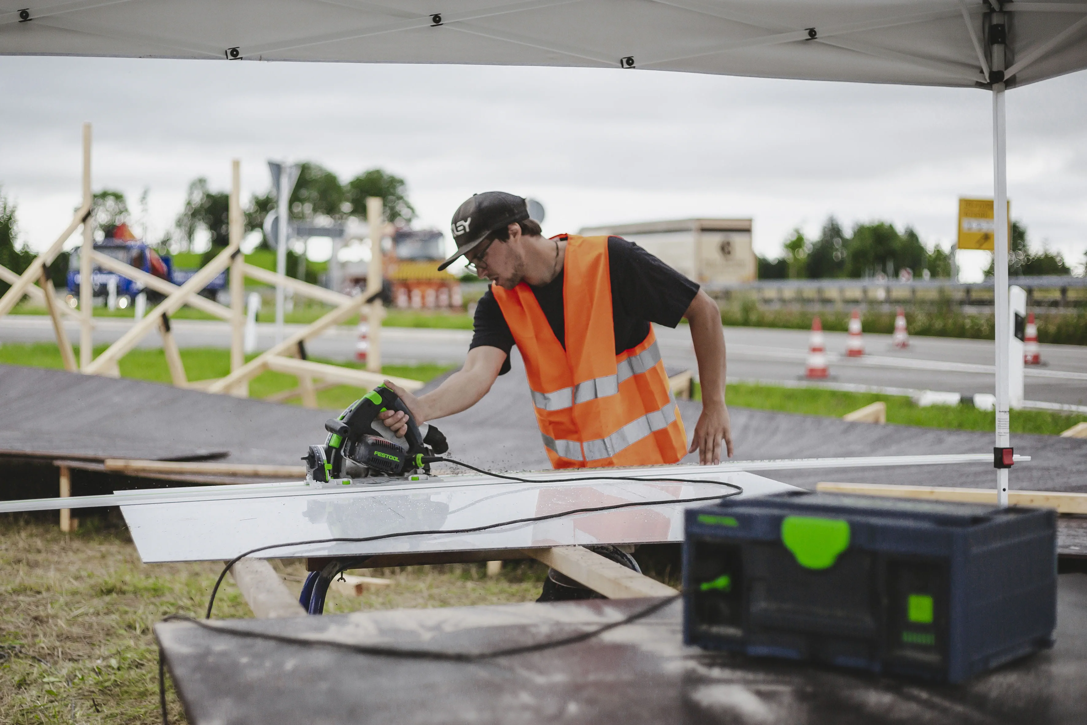 The high-calibre tradespeople were aided by the best tools: Cordless circular saws and screwdrivers from Festool, as well as the new SYS-PowerStation. Their batteries were ideal given that a lot of power was required in the absence of sockets. Ahrens explains how well it worked: "We used a normal circular saw for a whole day with the SYS-PowerStation. It was the perfect tool for the job. It was enough to complete our work." We had professionals working for professionals on the "Tri-Battle Royale". Both the main players and the spectators were equally enthusiastic. "People are still talking about it," says Vanessa Zeller, responsible for marketing and design at Schneestern. It is clear that the company is well-known throughout the Allgäu region. The steep bank was a topic of conversation even on major German sports channels, despite the fact that this project was something completely different from the pump tracks, skate and snow parks created by the professional tradespeople to date.