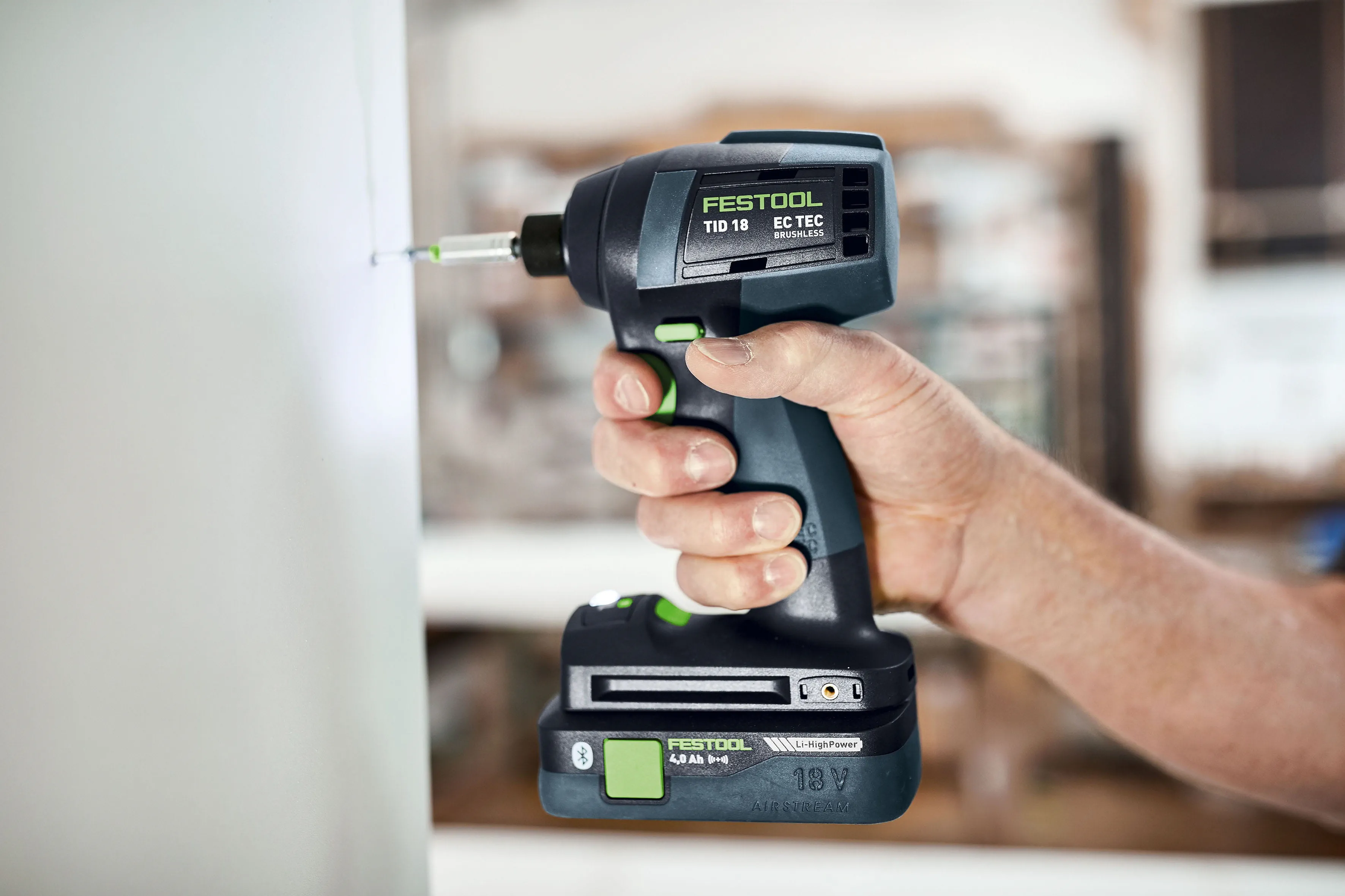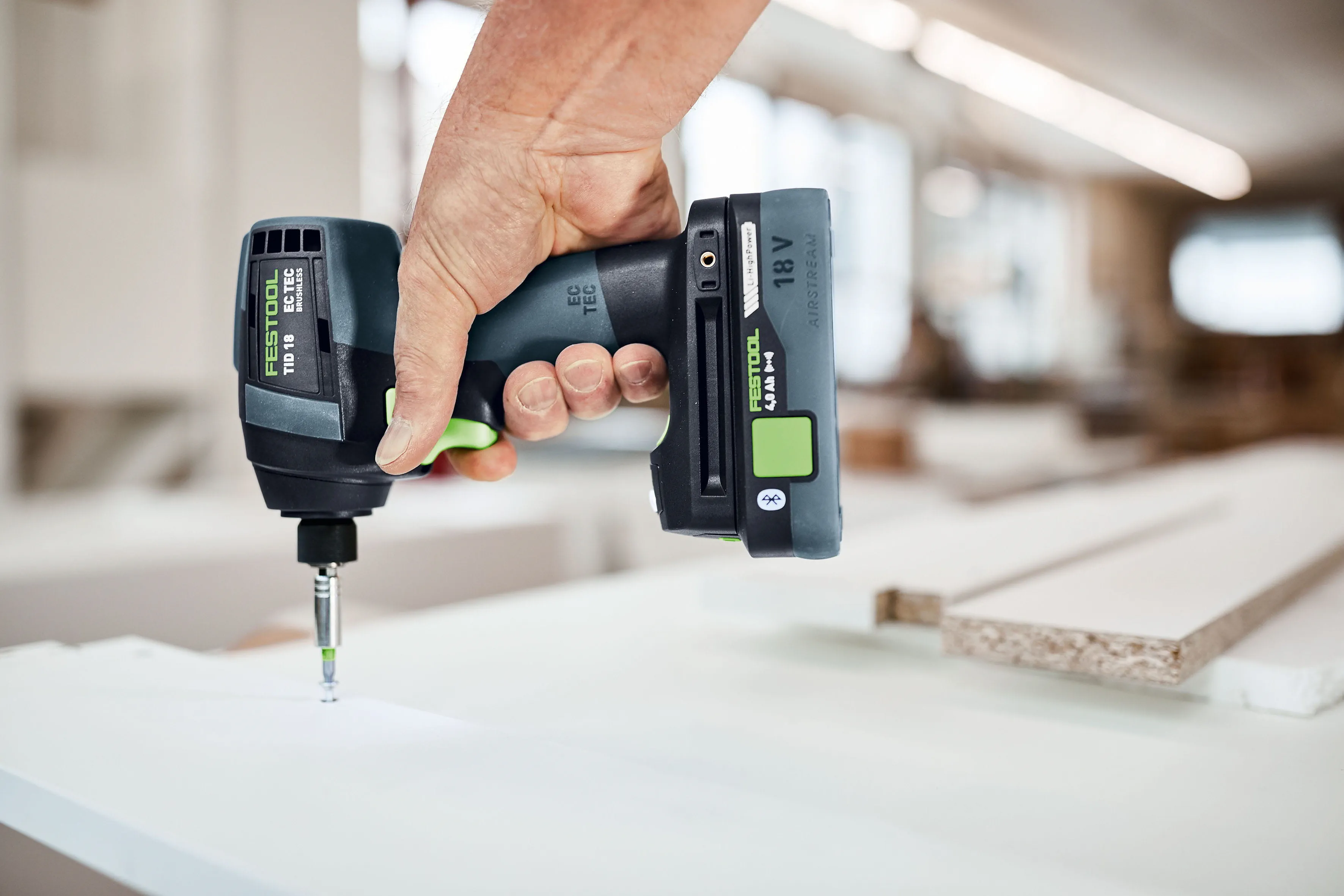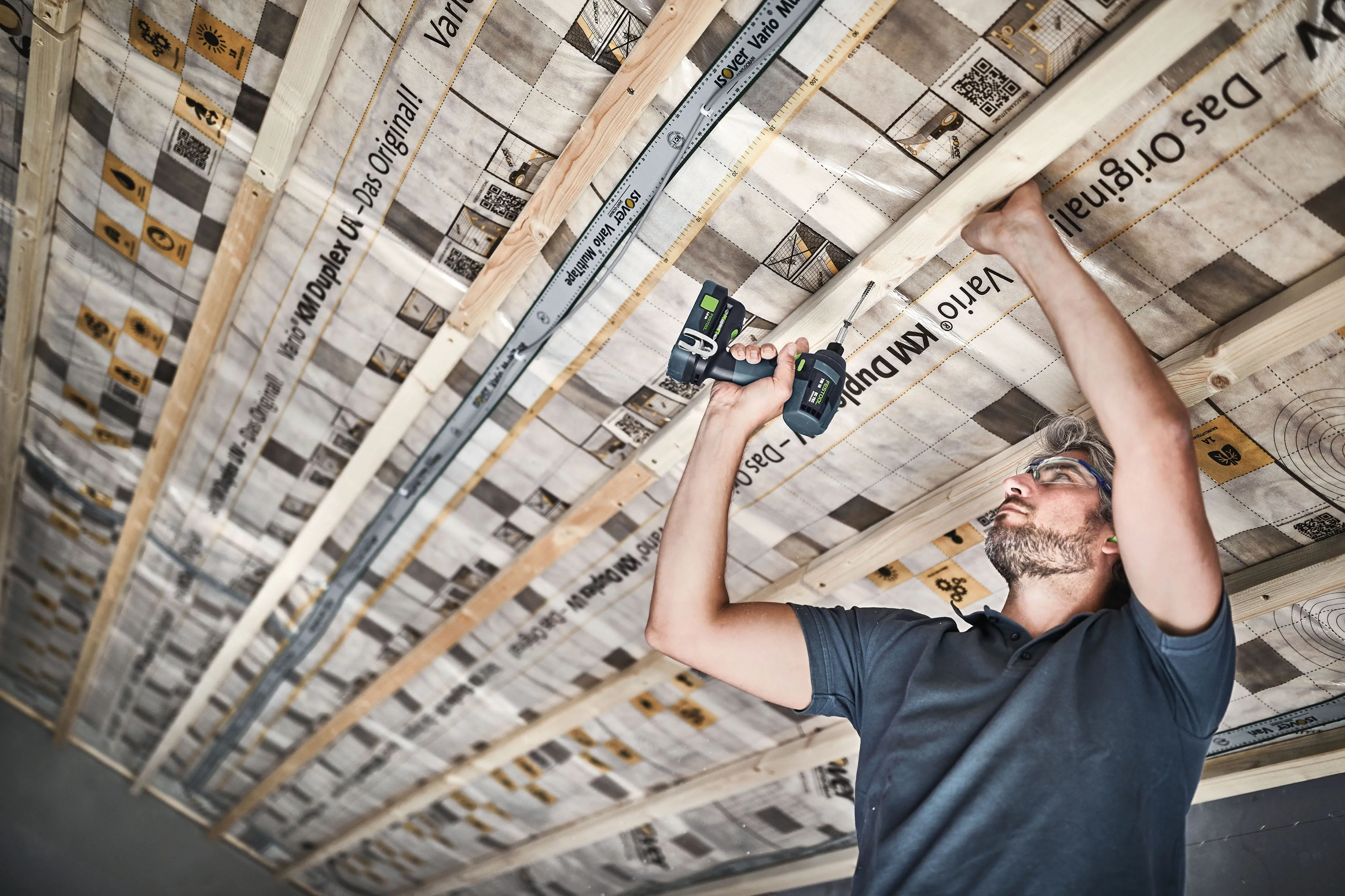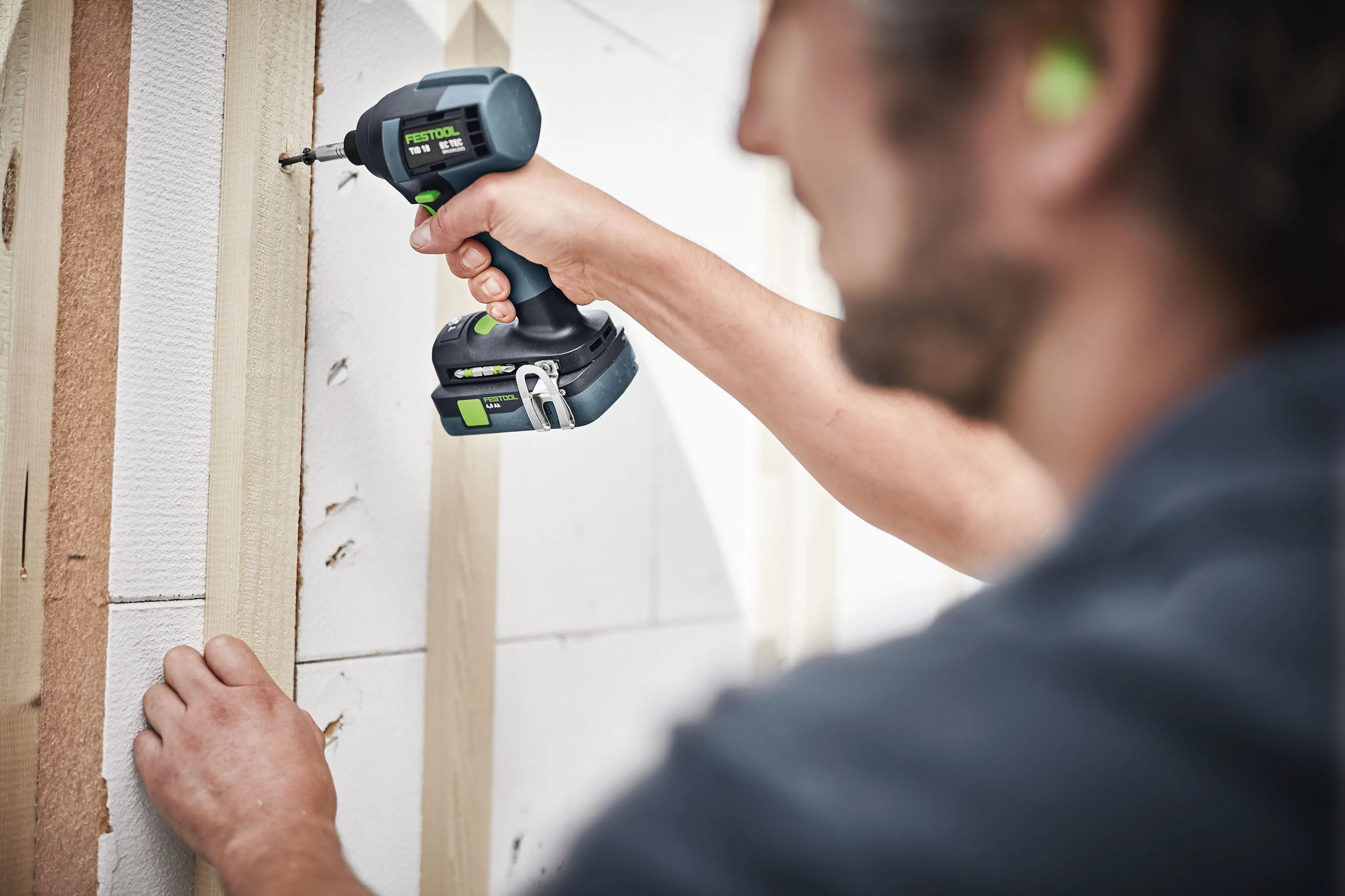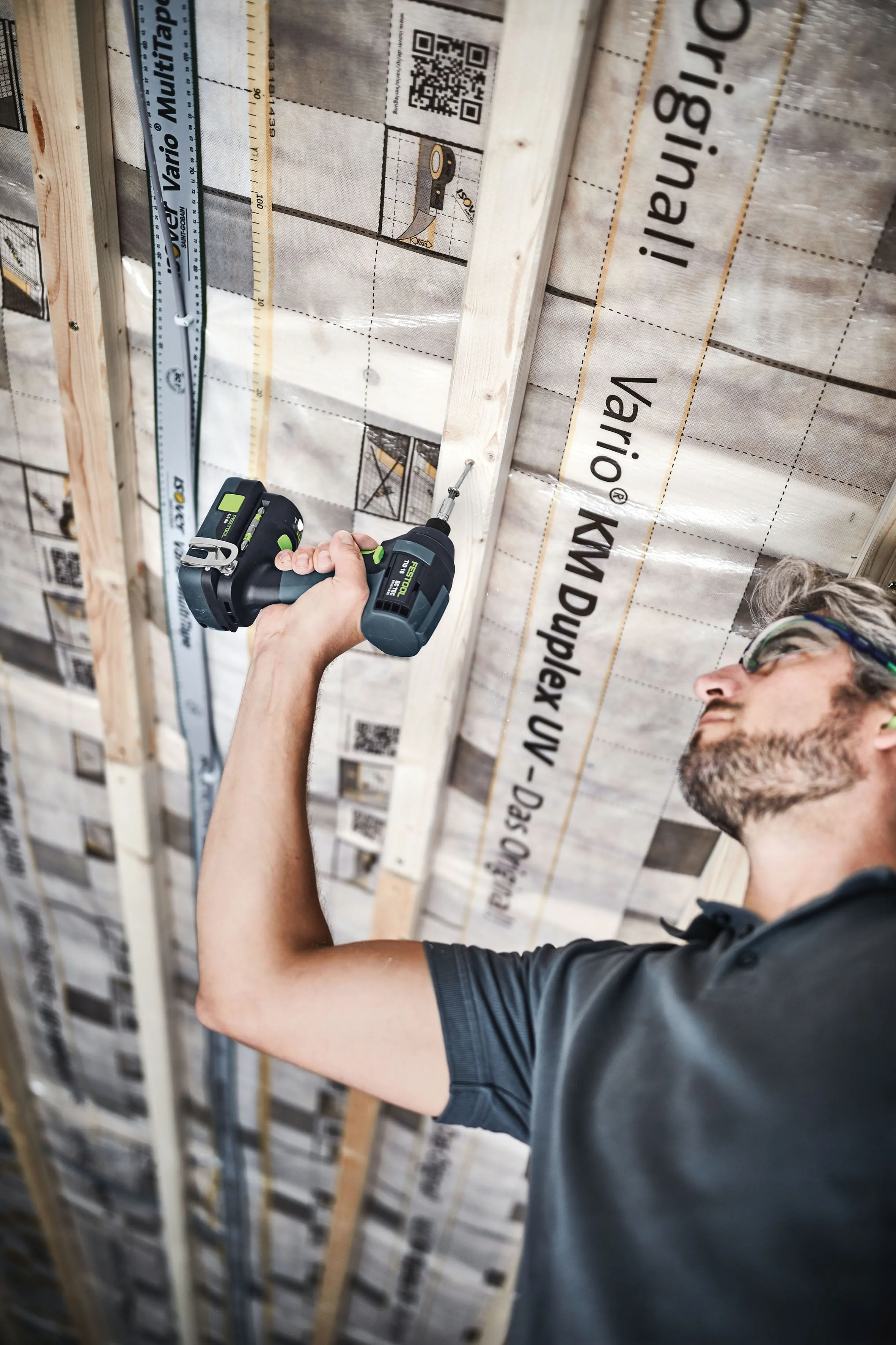 Those seeking a solution only for screwdriving – with optimum performance and endurance and no strength-sapping back torque – will benefit most from the TID 18 impact screwdriver. This tool enables screwdriving over long periods without tiring. Cordless impact screwdrivers are significantly lighter, more compact and enable working more comfortably – especially for repetitive screwdriving tasks. The essential feature here is the extremely low back torque, made possible by the tangential hammer mechanism which minimises impact on the wrist during screwdriving. Georg von dem Bussche, Festool trainer and master carpenter, explains: "The smart T-mode is an especially practical feature of the TID 18 cordless impact screwdriver. When fitting sheet metal to wood with self-tapping screws, the tool detects the transition between the different materials and automatically adapts the speed. To drill into the sheet metal as effectively as possible, the tool starts off driving in the screw with a high speed, low torque and without impact loading. Once the torque increases due to the commencing screwdriving process in the wood, the machine independently reduces the speed and only then begins impact loading."