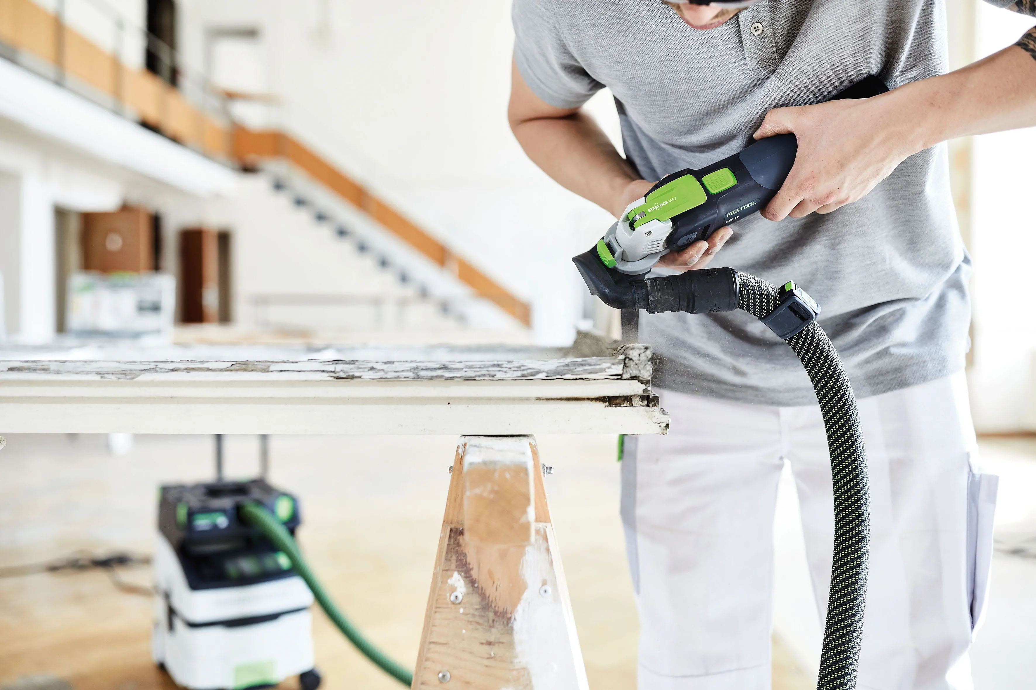 "Old coatings that are no longer intact and loose sections of wood need to be removed or, if necessary, rough-sanded for closer examination. Areas of failed adhesion or defective knotholes have to be removed first. A particularly good way to get this done quickly and accurately is with the VECTURO OSC 18 cordless oscillator," insists Philipp Stahl – skilled master painter and application engineer at Festool. "If you meet resistance when cutting, it's advisable to ease off rather than use force because too much heat doesn't do the old wood any good. Going full speed ahead isn't necessarily the best way to reach your goal. And that applies to oscillating as much as it does to the sanding work that comes after it. Of course, the aim of coarse sanding is to remove material, whereas fine sanding is all about the quality of the sanding finish. Yet there are subtle gradations in between. Application pressure and speed control are excellent ways to adapt to the work," says Stahl. In terms of technology and ergonomics, the VECTURO has everything you need for sawing, parting, scraping and cutting. Yet more importantly, however, it makes working in each of these applications every bit as easy as it is precise. And it starts with adding and changing attachments. In this regard, Festool trusts in the innovative tool holder StarlockMax. Thanks to the intelligent quick-change system, the saw blades can be changed in under three seconds with no additional tools required: Simply release the clamping lever, eject the tool, position the new tool and click it into place.