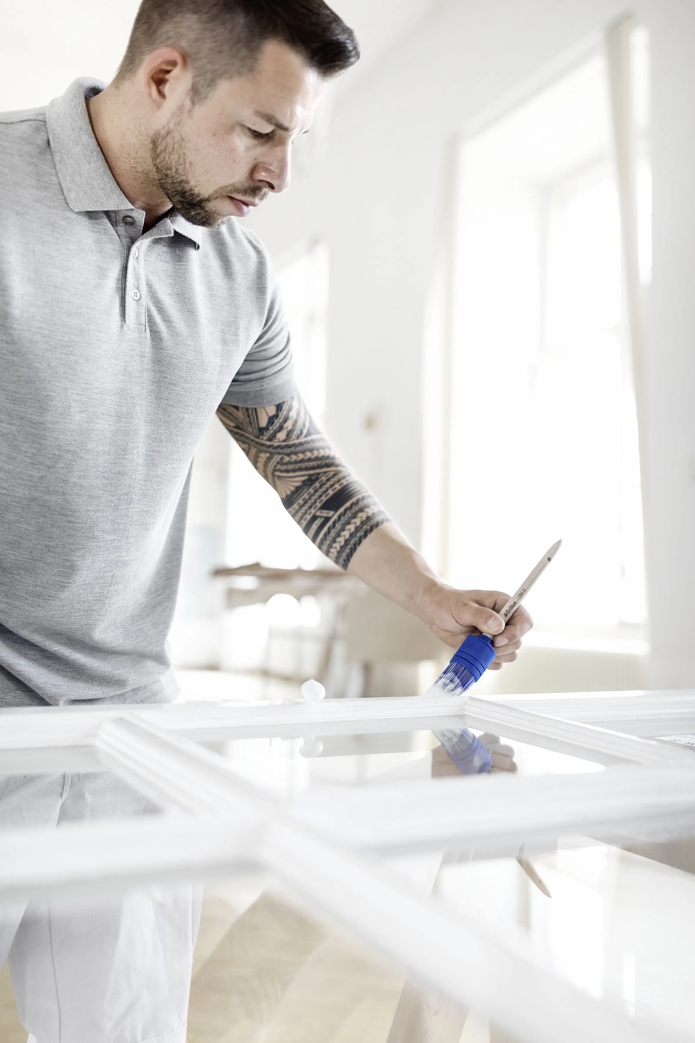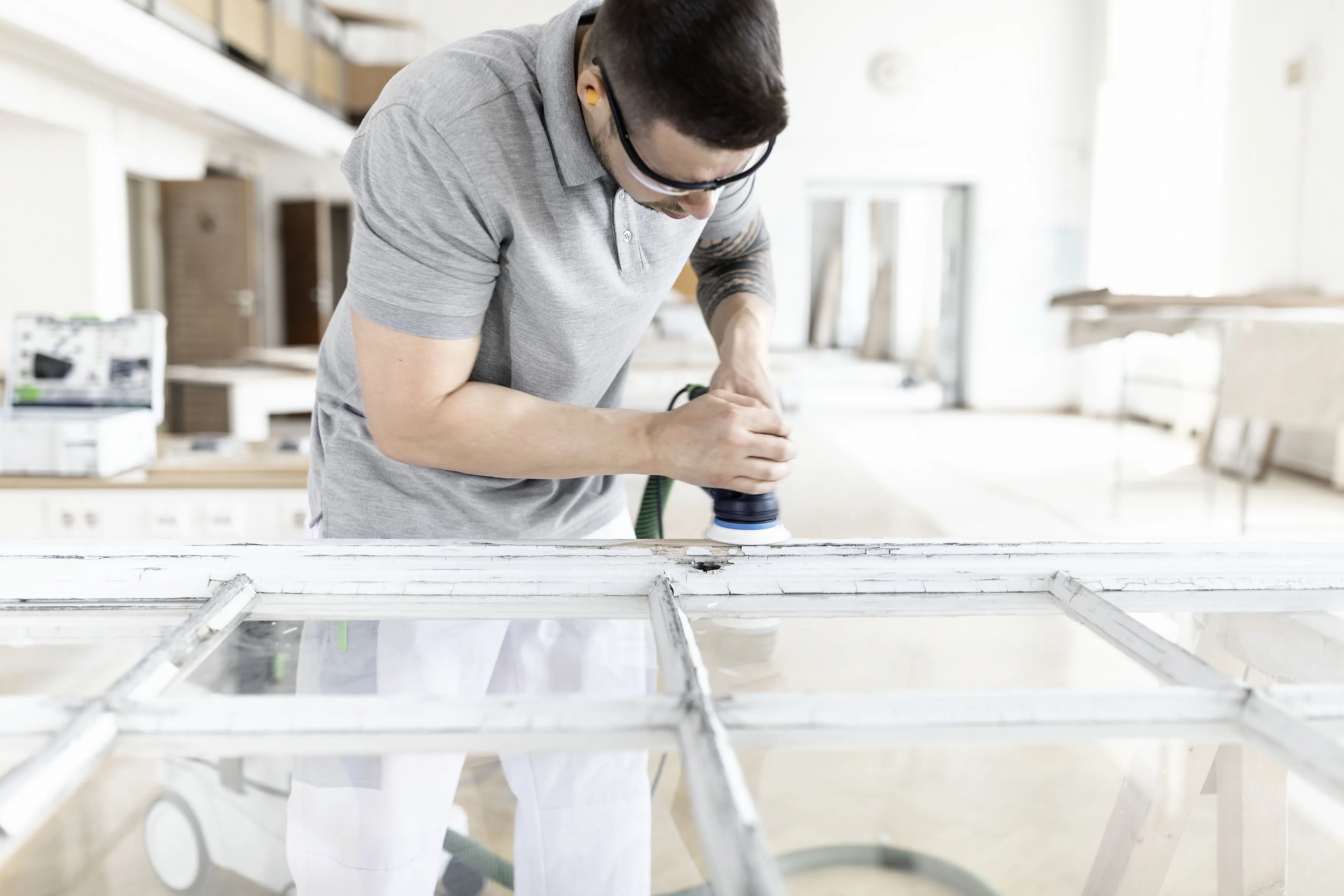 The next work step, where necessary, entails the meticulous removal of the window panes. "For the complete removal of the existing window putty, the cordless oscillator in conjunction with the SSB segment saw blade proves ideal," Stahl advises. "For the next work step – the removal of the old coating in the defective areas – we recommend the ROTEX RO 90 geared eccentric sander with the four functions of coarse and fine sanding, polishing and delta sanding." In the "coarse" setting, the gear drive is engaged, providing excellent material removal capacity and ensuring the fast and effective eradication of the old coating. For finer material removal, you set the RO 90 to "fine". Intact coatings can then be lightly sanded and roughened for subsequent coatings. For corners and rebates, the delta sanding pad can be fitted without any additional tools. In this way, the same tool can be used to sand or roughen the surface in every corner. As window frames and casements have few flat surfaces and many edges, the sanding disc size and geometry and the material removal capacity of the RO 90 make it ideal for window restorations. "It's right here that the RO 90 demonstrates its advantages over hand sanding or other types of sander. I know that sanding by hand is very popular at this point but, in the long run or with too many window frames, it isn't particularly effective. Also, particular care is called for when sanding close to the edges on windows – whether by hand or with a sander. "For precisely these kinds of applications, we recommend the use of our protectors. These protect against damage to the window pane. From experience, we craftspeople know that sanding damage to the glass is difficult to rectify afterwards. The same applies to silicone joints, by the way, because once these are damaged, they almost always need to be completely replaced – and then it starts to get really expensive," explains application engineer Stahl.