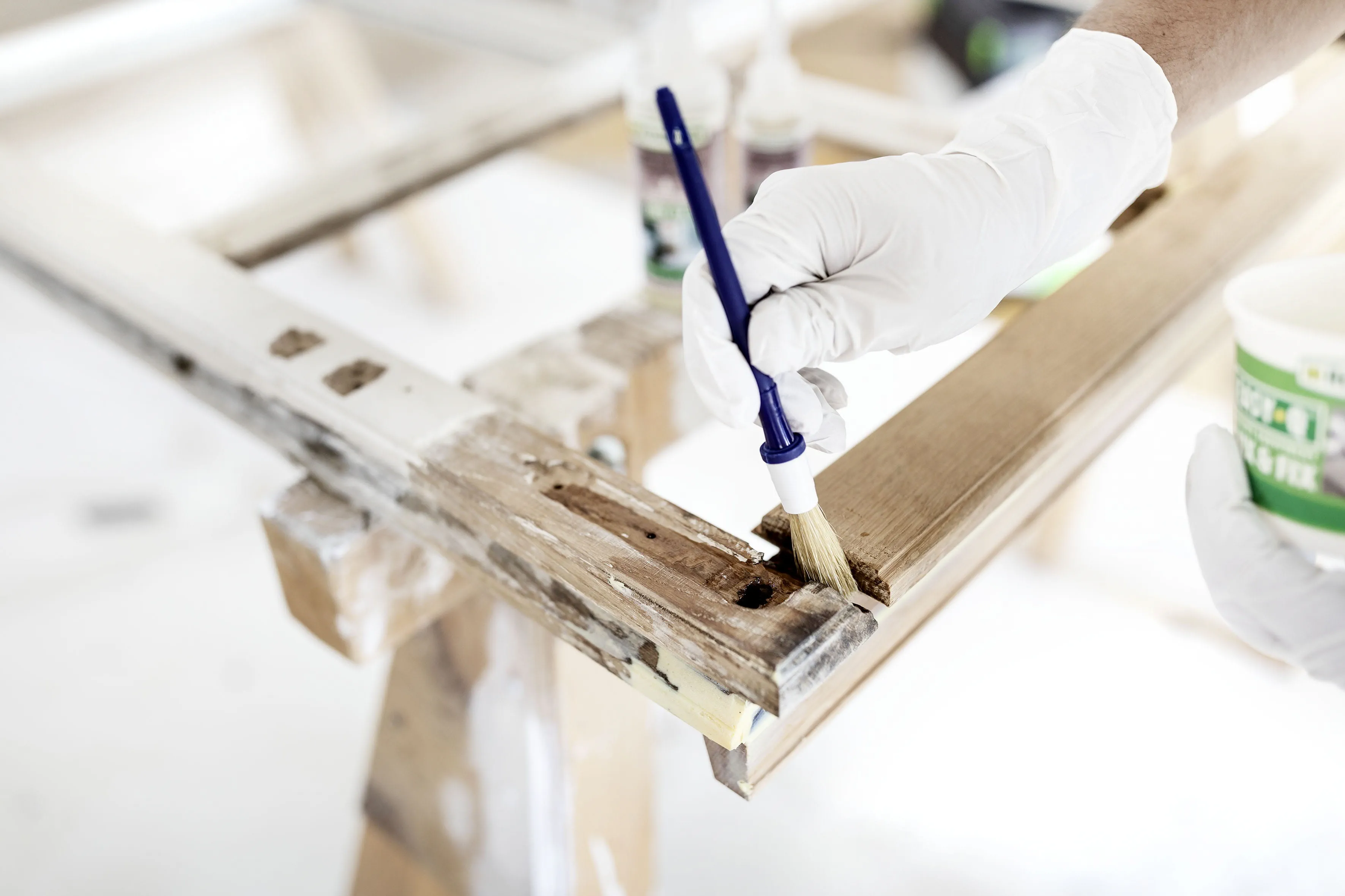 After the old coating and defective material have been removed, the condition of the repair areas is inspected again. "For the rebuilding of defective areas on windows, we've discovered that the system from Repair Care combined with our own system solutions delivers optimum results," says Stahl. Following the condition inspection, the DRY FIX UNI wood stabiliser is applied to the defective areas with a soft brush. This strengthens the adhesion of the subsequent DRY FLEX wood repair compound and thereby prolongs the life of the window. For application of the wood repair compound, the two components are mixed with a putty knife on a smooth surface. The repair area can then be built up with DRY FLEX and worked to a smooth finish with the putty knife. Afterwards, the DRY FLEX wood repair compound is worked smooth across the defective area. It is essential to ensure that the voids are completely filled in with no inclusions of air. After the wood repair compound has cured, any excess build-up can now be sanded level. "We recommend using the ROTEX RO 90 with the "coarse" setting. After sanding, the worked area should be inspected once again. Particular attention should be paid to the transition between the wood and DRY FLEX wood repair compound. It must produce a flat surface," Stahl explains. Before the pane is fitted, the rebate must be primed and the DRY SEAL window putty applied in the rebate with a cartridge gun. After this, the pane can be fitted and the second layer of the DRY SEAL window putty applied and smoothed to a water-repellent finish. The finishing touches involve the obligatory primer, undercoat and top coat or paint, which can be applied by brush or roller.