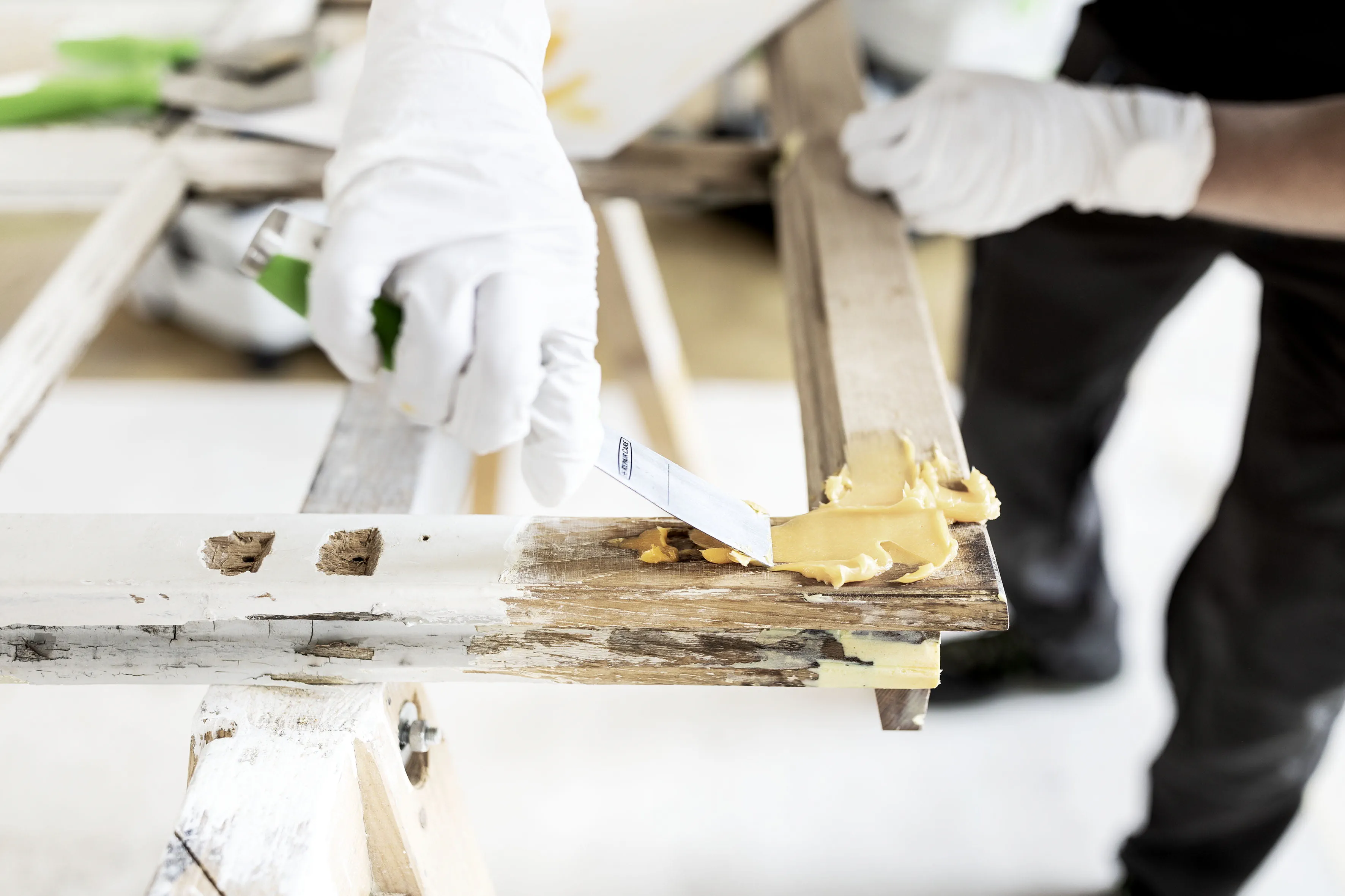 First and foremost, care means preserving as much as possible of the original material. The same applies, of course, to window constructions in typical old buildings in need of modernisation. Before a window renovation begins, it is essential to assess its current condition in advance. This is easiest to do if the window is removed and placed on a suitable underlay so that it can be examined in close detail: Where are defects present? How badly is the paint peeling off? Is the window putty still intact? Can the frames still be used? How much of the frames can be preserved? How old is the wood and the coating? What kind of coating system is in place?