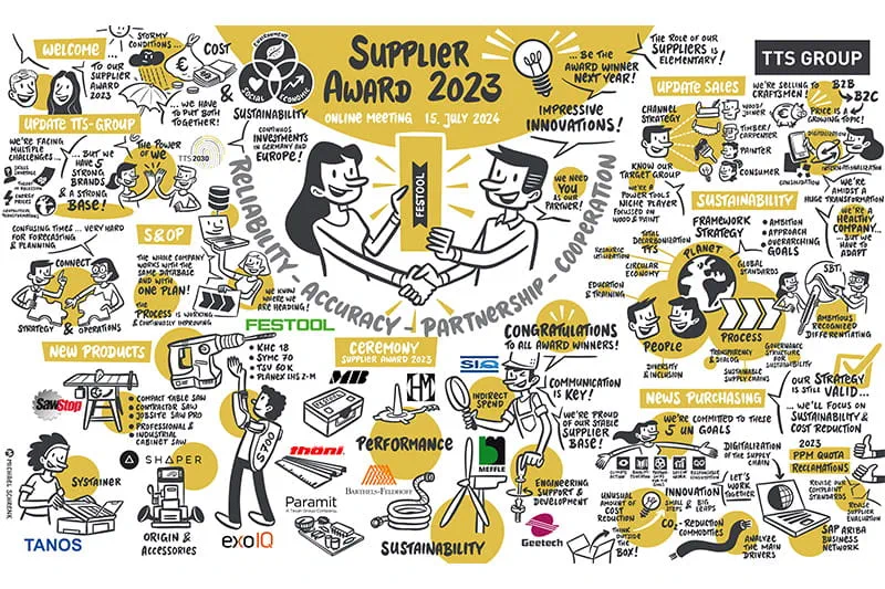 We rely on strong suppliers. On July 15, TTS Group with the brands Festool, exoIQ, SawStop, Shaper and TANOS GmbH honoured our suppliers for exceptional performance in eight categories - measured in terms of quality, delivery reliability, efficiency, sustainability and partnership for the 2023 financial year. We held the award ceremony online in our studio in Wendlingen and around 180 suppliers from the regions of Europe, Asia and the USA took part for the Production Material, OEM and Indirect Material categories have participated.